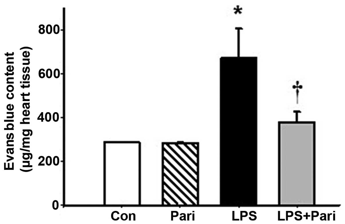 Endotoxemia is characterized by an increase in vascular leakage (12); thus, in this study, we examined the effects of paricalcitol on LPS-induced myocardial permeability using Evans blue dye, as previoulsy described (12). At 16 h after the LPS injection, myocardial vascular leakage was significantly increased. Treatment with paricalcitol significantly suppressed the LPS-induced increase in vascular leakage (Fig. 4). These data suggested that paricalcitol exerted protective effects against LPS-induced myocardial vascular leakage.
