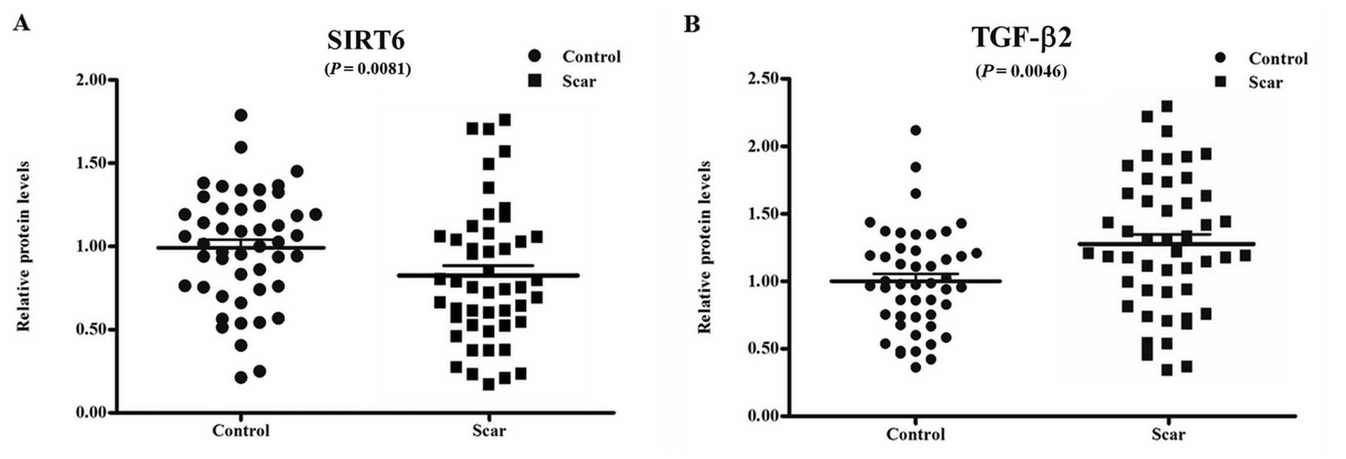 As mentioned in Materials and methods, following laminectomy, the removed lumbar disc tissues were collected, labeled and saved at −80°C. Two years later, an investigation was undertaken to confirm whether each patient had an epidural scar and whether there had been a relapse of lumbar disc herniation. A total of 48 scar-free patients and 48 patients who developed an epidural scar were randomly selected. Expression of SIRT6 and TGF-β2 in their lumbar disc tissues sampled previously was detected using western blotting, and the results showed that SIRT6 levels in the patients with epidural scarring were significantly lower than those of scar-free patients (Fig. 1A). By contrast, TGF-β2 expression in the patients who suffered an epidural scar was much higher than that of scar-free patients (Fig. 1B). These results suggested that lumbar disc SIRT6 expression is associated with epidural scar formation and also TGF-β2 expression.