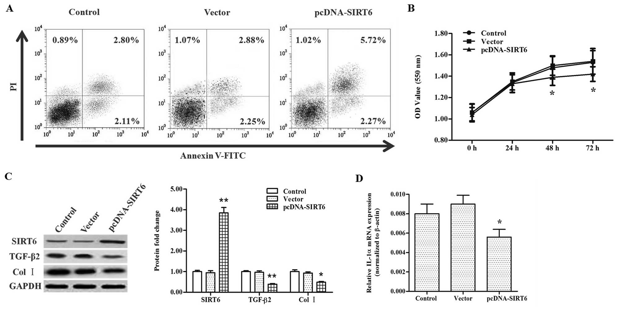 In order to explore the role of SIRT6 in EF and scar formation in vitro, epidural scar samples were taken from the patients, and primary fibroblasts were isolated using the collagenase I digestion method. A pcDNA-SIRT6 expression vector was built and transfected into the primary cells. After incubation for 72 h, the cells were stained with PI/annexin V followed by flow cytometric analysis. The results showed that the proportion of viable cells was reduced by pcDNA-SIRT6 transfection but there were no marked changes in the proportion of early apoptotic cells among the groups (Fig. 2A). MTT analysis also demonstrated that pcDNA-SIRT6 transfection reduced the viability of the cells (Fig. 2B). The levels of TGF-β2 and Col I proteins, as well as IL-1α mRNA, were determined by western blotting and qPCR, respectively. The data indicated that SIRT6 overexpression caused a significant decrease in TGF-β2 and Col I protein levels (Fig. 2C) and the IL-1α mRNA level (Fig. 2D). These data indicated that SIRT6 suppressed EF, which manifested as suppression in fibroblast proliferation, TGF-β2 and IL-1α expression, as well as Col I production.