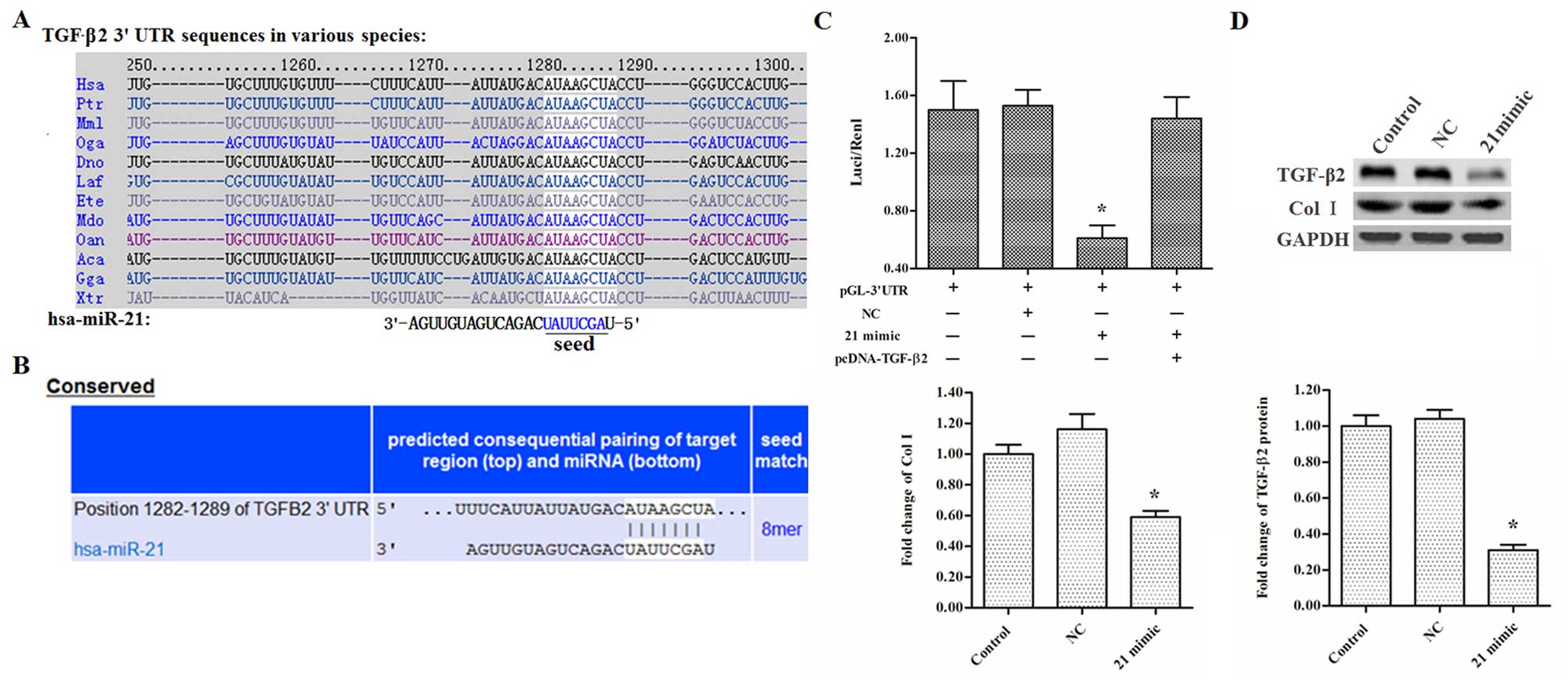 The 3′-UTR of TGF-β2 mRNA was amplified by PCR, using primers linked with the XhoI and NotI restriction sites, respectively. Both the primers were designed and synthesized by Genscript Co., Ltd., (Nanjing, China). The PCR products were excised with NotI and XhoI and inserted into the pGL-2 vector (Promega, Madison, WI, USA) at the 3′-end of the Renilla gene CDS. Firefly luciferase activity was used as the internal control. The 3′-UTR dual-luciferase vectors were transfected or co-transfected with the miR-21 mimic or pcDNA-TGF-β2 expression vector into the primary fibroblasts (100% confluence) using X-tremeGENE 9 DNA transfection reagent (Roche, Basel, Switzerland). The medium was changed 6 h later. Cells were incubated for another 48 h with commercial cell lysis buffer (Merck, Whitehouse Station, NJ, USA). The luciferase activity was measured using a luminometer (Promega) according to the manufacturer's instructions.