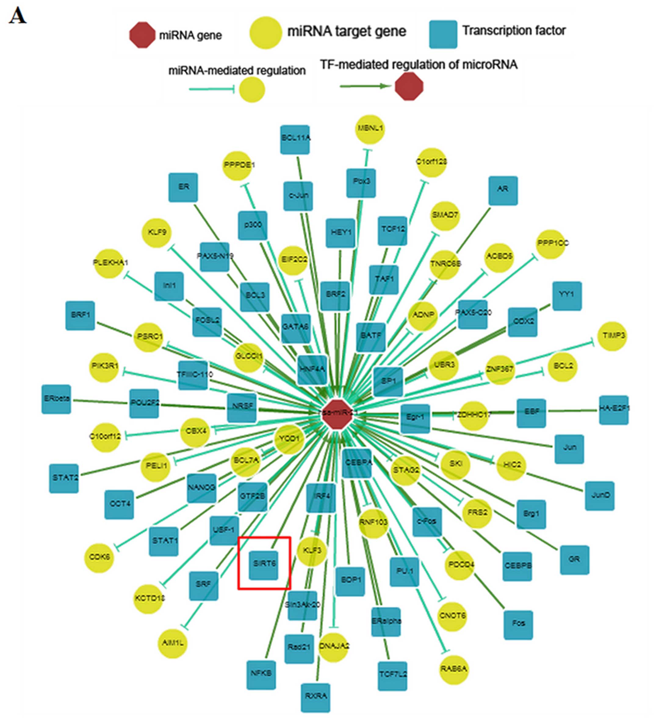 The regulatory association between SIRT6 and miR-21 was calculated using the online platform ChIPBase (http://deepbase.sysu.edu.cn/chipbase/), which is an integrated resource for decoding transcription factor binding maps, expression profiles and the transcriptional regulation of non-coding RNAs and protein-coding genes from ChIP-seq data. The targeting association between miR-21 and TGF-β2 was predicted with TargetScan (http://www.targetscan.org/), an online resource.