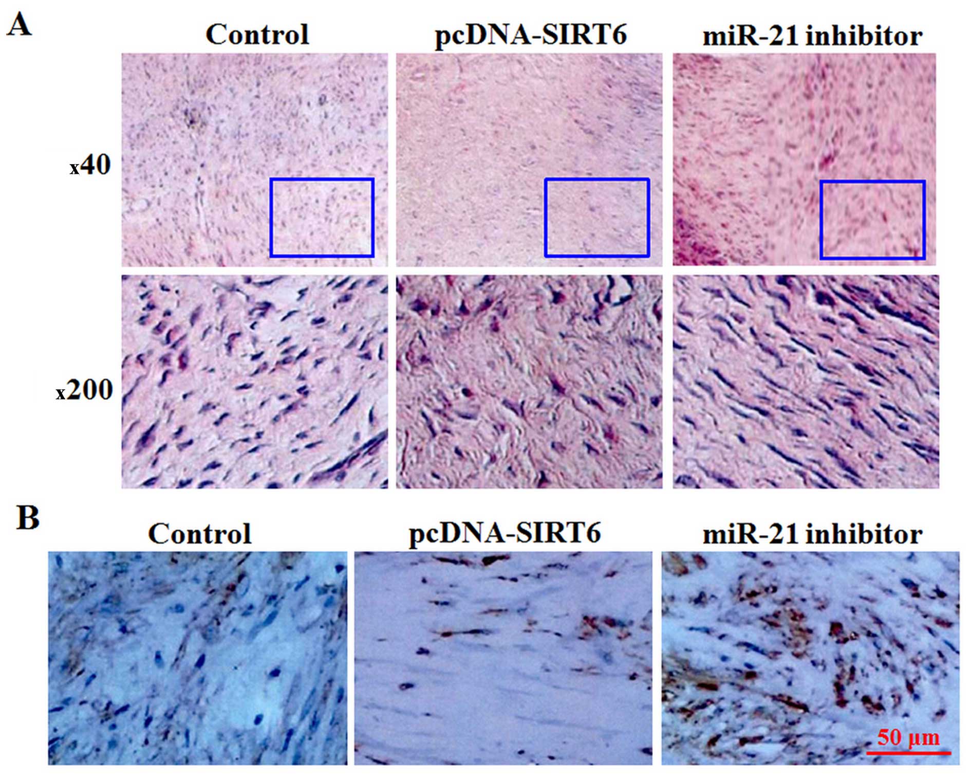 The pcDNA-SIRT6 overexpression vector and empty vector were kindly presented by Professor David Lohnes (Department of Cellular and Molecular Medicine, University of Ottawa, Ottawa, ON, Canada). The 2′-OMe modified miR-21 mimic/inhibitor or NC mimic/inhibitor were synthesized and confirmed to be effective by Invitrogen Life Technologies.