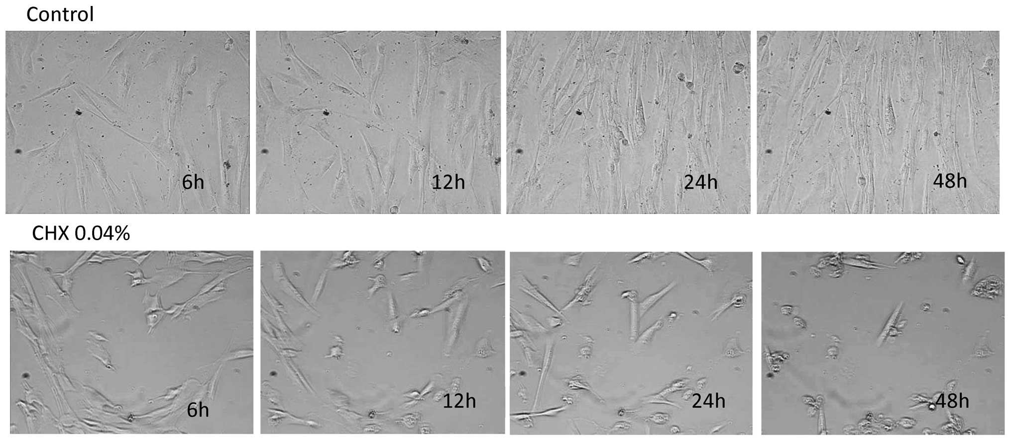 In this study, during the constant microscopic observation of cell morphology and growth in conditions similar to those observed in vivo, we observed that either cell morphology or growth did not exhibit any changes in comparison with the control group following stimulation with 0.002% CHX. In the cells stimulated with CHX at the concentrations of 0.01 and 0.02% a decrease in both the dynamics of cell proliferation and the number of cell divisions was noted, although only in the final hours of observation. There were no significant changes observed in fibroblast morphology between these two groups. In the cells stimulated with 0.04 or 0.2% CHX, the progressive inhibition of growth and cell division was observed, which was most significant at 32 h with CHX at 0.04%, and at 16 h with CHX at 0.2%. At these time points, only small round-shaped cells were observed. These results are different from the ones presented in the literature. Giannelli et al (7) used the concentration of CHX similar to ours; however, following long-term treatment (5 and 15 min), the authors observed massive cell death with any concentration used (using the calorimetric method and confocal microscopy). The results were established 4 h after exposure. Even following short-term treatment (1 min) with higher concentrations of CHX (0.03–0.12%) a significant reduction in cell viability was observed.
