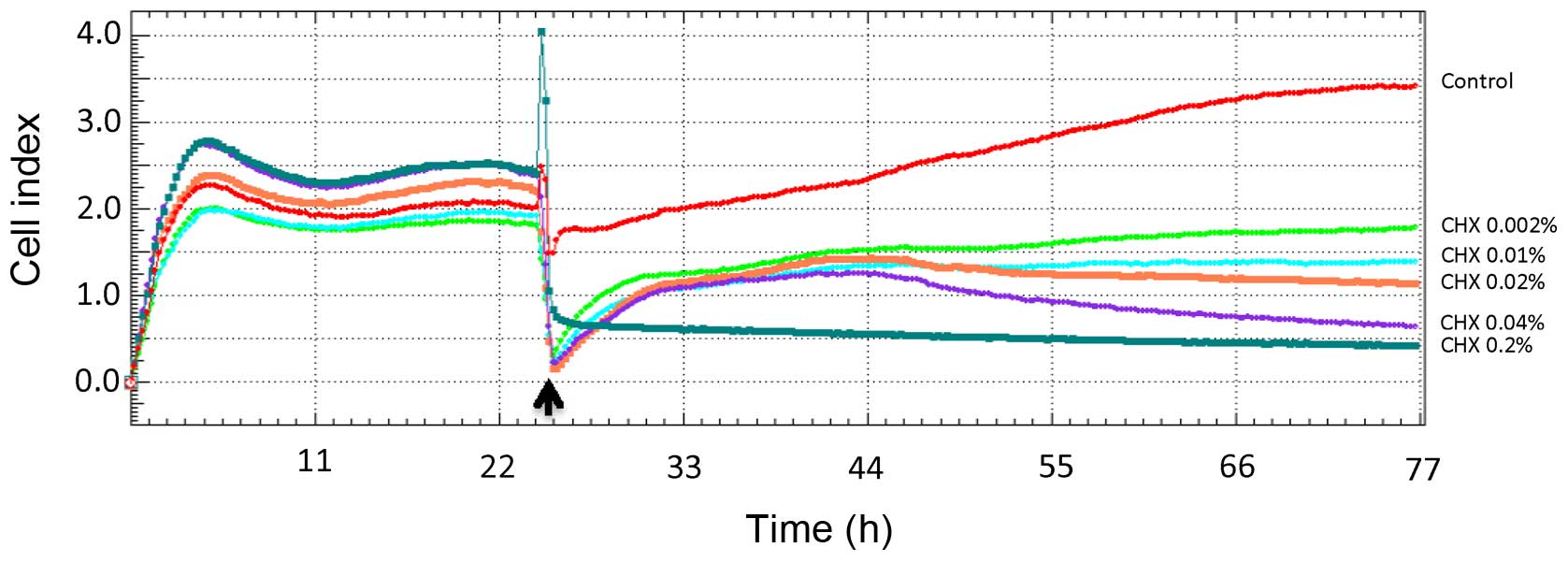 Due to the fact that the xCELLigance system is an impedance-based platform, the changes in the CI value can also be interpreted as morphological changes in the cells. The decrease in the CI value associated with the highest CHX concentrations used could result from both the diminished cell proliferation rate and cell morphological changes, namely the decrease in the number of cell divisions and the appearance of small round-shaped cells.