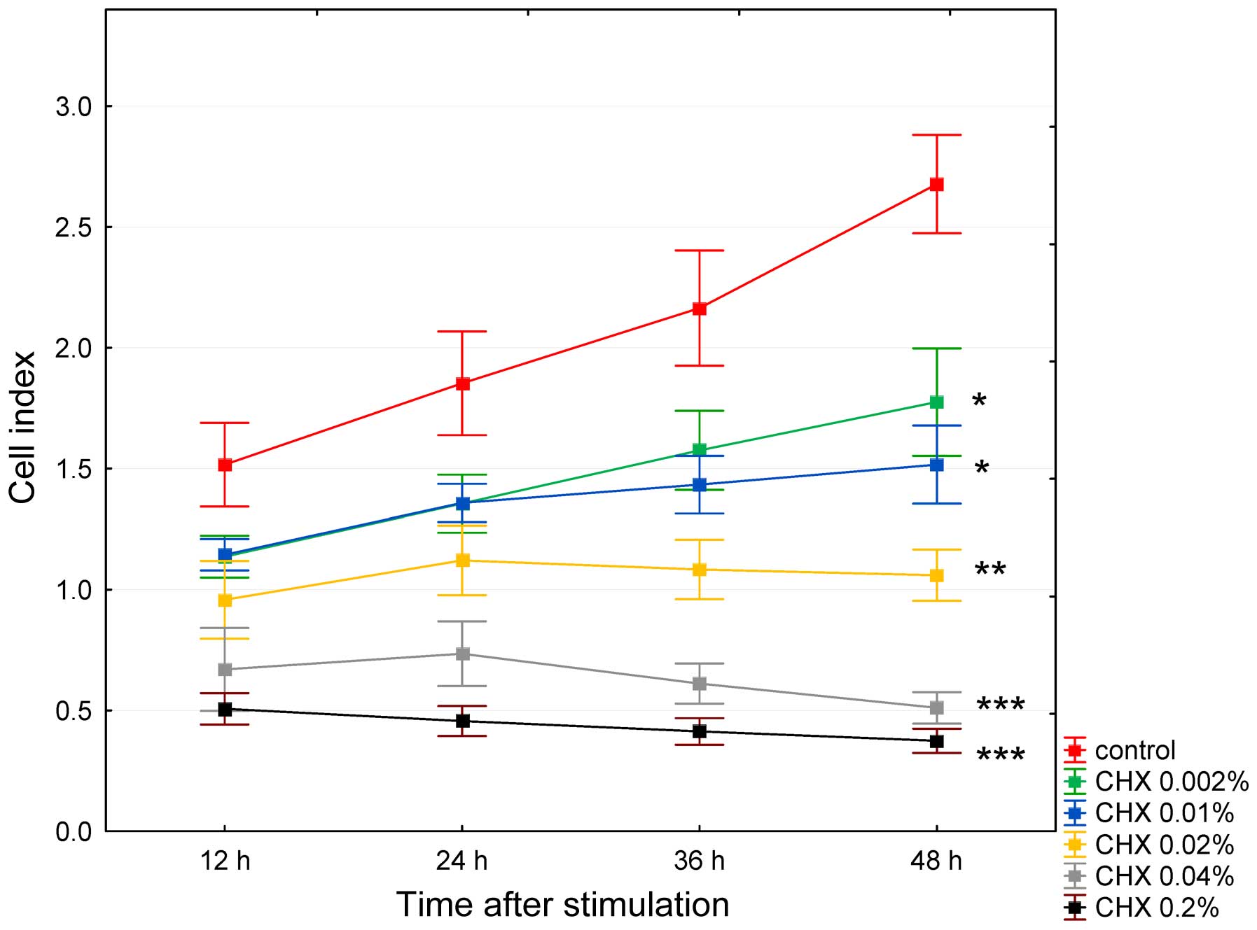 The comparison of the results from studies on the effects of CHX on periodontal tissue is complicated and practically impossible due to the different research methodologies applied by different authors; in particular, the duration of cell exposure, the CHX concentrations and the media used. Therefore, the most important aim of this study was to use the methods (PANsys 3000, xCELLigence) that allow us to observe the effects of CHX on cell lines in conditions similar to those observed in vivo and in real-time, and to deliver the most reliable results.