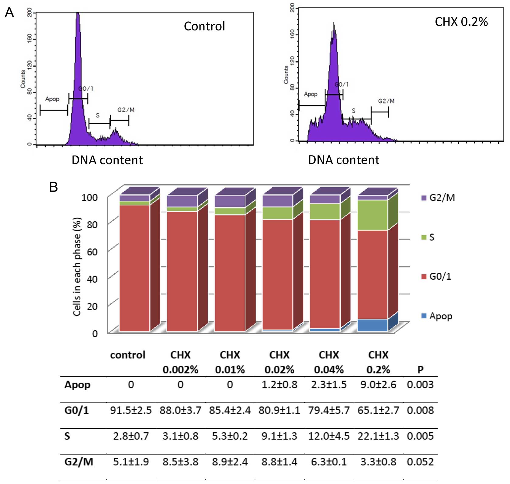 Our results suggest that CHX induced cell cycle arrest at the S phase. Both the number of cells at the G0/G1 and G2/M phase decreased, while the number of cells at the S phase increased. Hidalgo et al (8) observed that CHX exerted an inhibitory concentration-dependent effect on DNA synthesis from the concentration as low as 0.0001% in dermal fibroblasts. In this study, the changes in the cell cycle were observed at the concentration of 0.04% (minimum). Looking at this discrepancy, one can speculate that CHX exhibits a different degree of cytotoxicity towards different cell types. However, this difference may also be due to the different times of cell exposure to CHX. Hidalgo et al (8) incubated cells with CHX for 3, 6, 8 and 24 h, whereas we incubated the cells with CHX for 15 min. These could also be reasons for differences in DNA synthesis observed in our study. Hidalgo et al (8) used 5-bromodeoxy-uridine (BrdU), a thymidine analogue that is incorporated into the cells during the DNA synthetic phase of replicating cells (during the S phase of the cell cycle). They observed a significant decrease in BRdU incorporation that occurred at the concentration of 0.0001% CHX, which reflects the decrease in the number of cells in the S phase. We observed the concentration-dependent accumulation of cells in the S phase together with a decrease of cells in the G2/M phase following stimulation with CHX, which indicates that these cells do not seem to re-enter the cell cycle. It cannot be excluded that CHX is able to modify cell culture conditions so that quiescent S phase cells appear. Thus, the accumulation of inactive cells in the S phase would accompany the decreasing frequency of BrdU-positive cells. However, further research is warranted to confirm these findings.