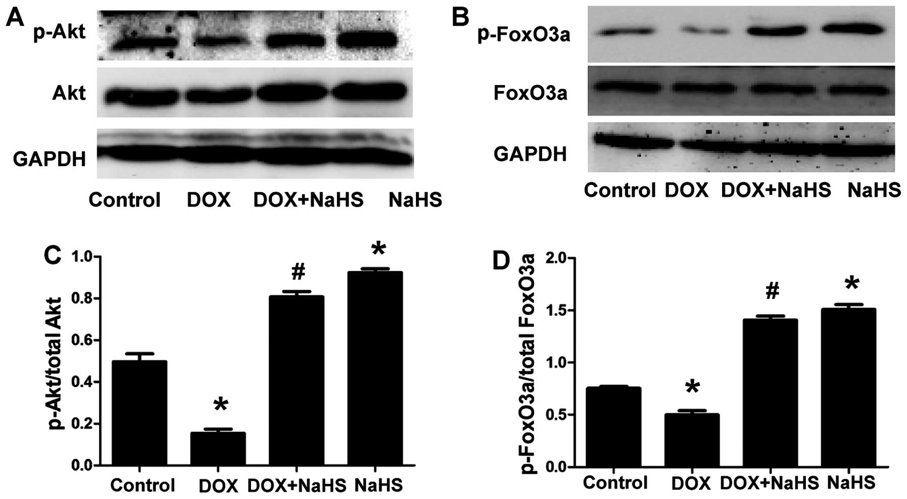 To determine whether the cytoprotective effect of H2S against DOX-induced toxicity was associated with the PI3K/Akt/FoxO3a pathway in H9c2 cells, we examined the effect of NaHS on the expression of p-Akt and p-FoxO3a. The results showed that treating the H9c2 cells with 100 µM NaHS (a donor of H2S) for 30 min prior to exposure to 5 µM DOX for 24 h significantly increased the phosphorylation of Akt and FoxO3a (Fig. 3). Furthermore, NaHS treatment alone also significantly increased the levels of p-Akt and p-FoxO3a compared with the DOX-treated groups. The total Akt and FoxO3a levels remained unchanged among the four groups. These results suggested that the PI3K/Akt/FoxO3a pathway was involved in the protective effect of H2S.