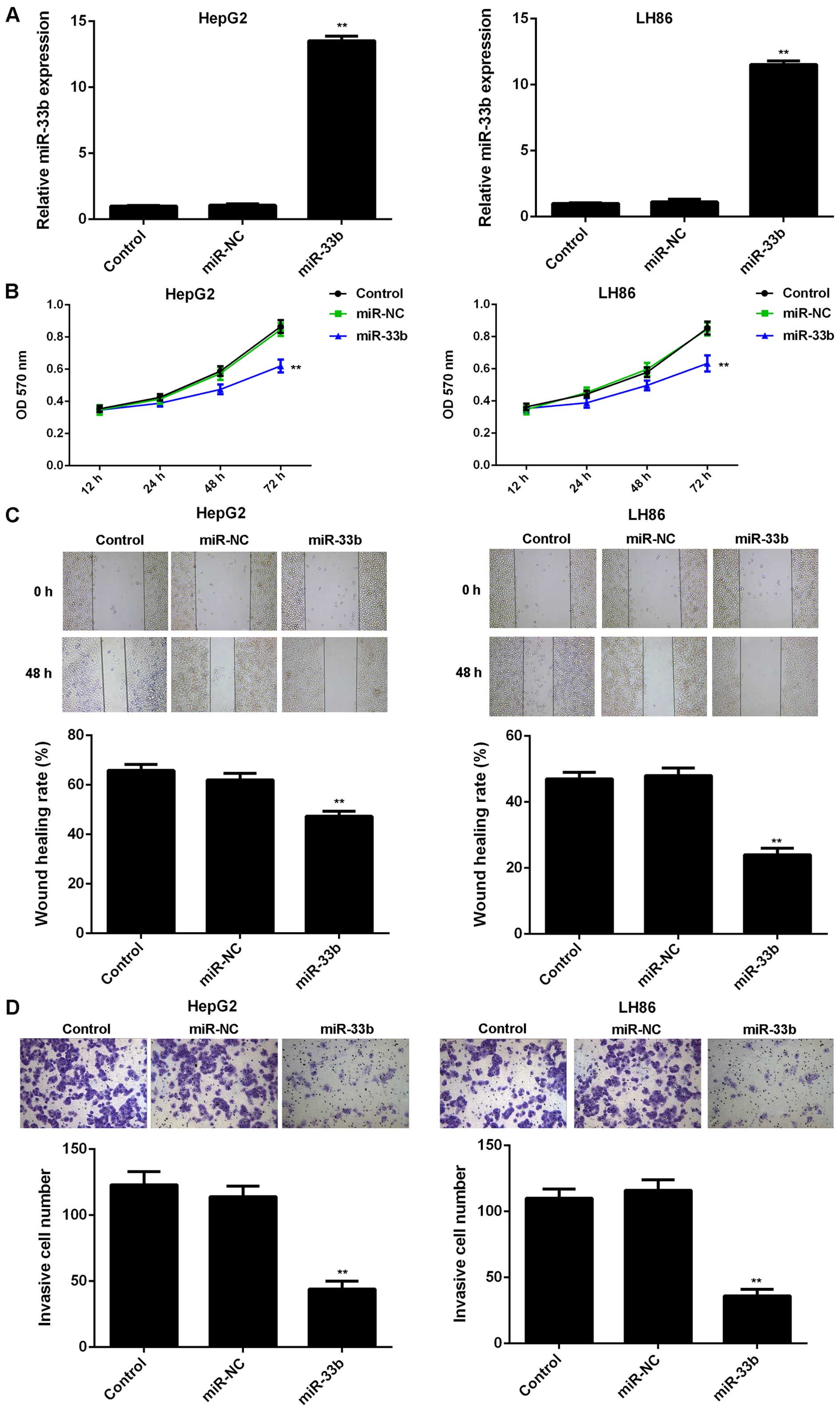As the HepG2 and LH86 cell lines showed the most significant decrease in miR-33b expression, we used them in our in vitro experiments to determine the role of miR-33b in regulating HCC cell proliferation, migration and invasion. As miR-33b was downregulated in HCC, a miR-33b mimic was used to transfect the HepG2 and LH86 cells in order to upregulate the expression of miR-33b. As shown in Fig. 2A, the expression level of miR-33b was decreased in the HepG2 and LH86 HCC cells following transfection with the miR-33b mimic, when compared to the control group (P<0.01). However, transfection with miR-NC induced no change in miR-33b levels in the HCC cells (Fig. 2A). MTT assay, wound healing assay and Transwell assay were further conducted to examine cell proliferation, migration and invasion, respectively. The overexpression of miR-33b led to a significant decrease in the proliferation, migration and invasion of the HepG2 and LH86 cells, compared to the control group (P<0.01; Fig. 2B–D). These data indicate that miR-33b plays a suppressive role in HCC growth and metastasis.