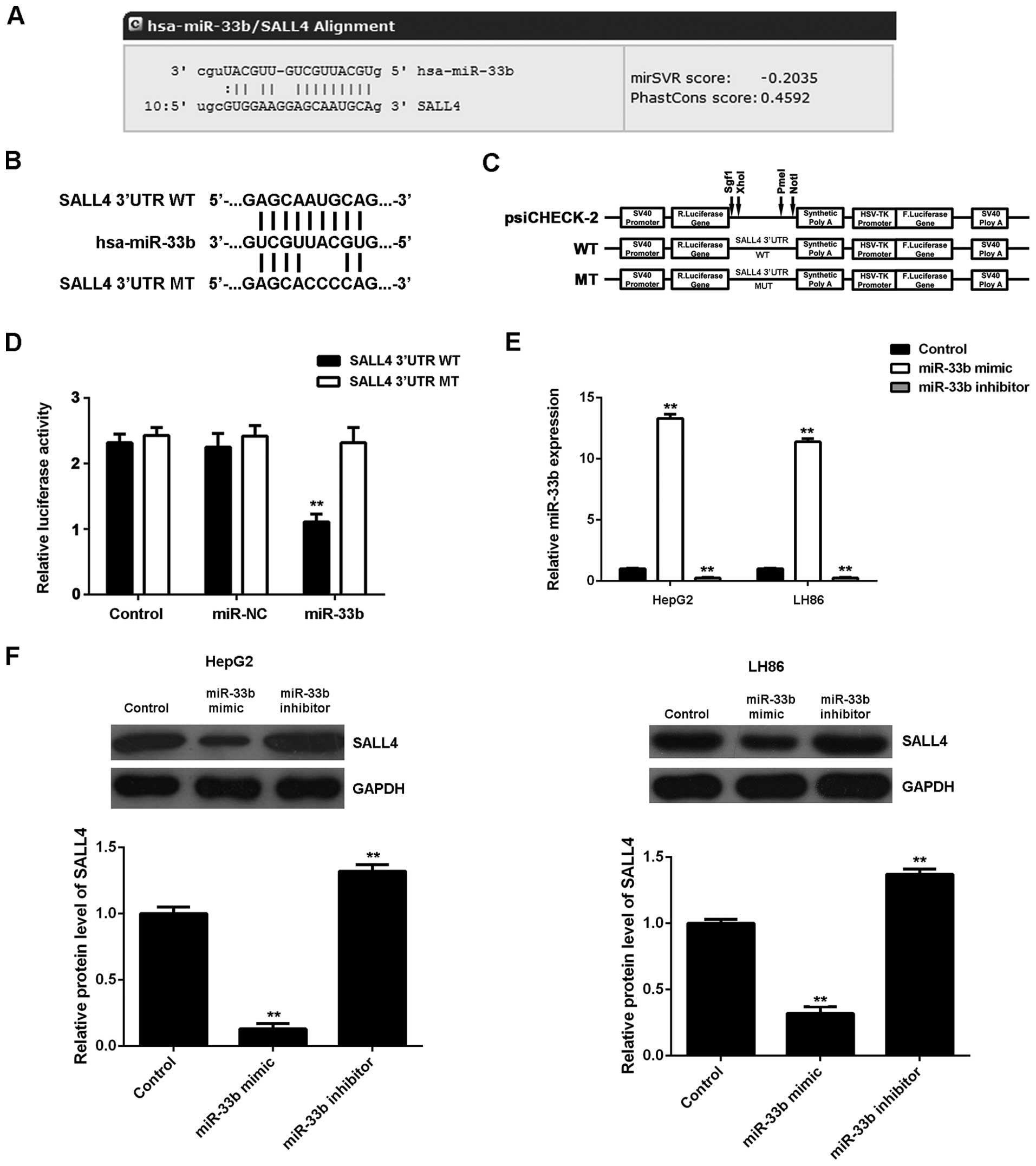 We then focused on the putative targets of miR-33b in HCC cells. Bioinformatics analysis was performed to predict the targets of miR-33b. As shown in Fig. 3A, SALL4 was found to be a putative target gene of miR-33b. To further clarify this prediction, we generated the luciferase vectors containing WT or MT of SALL4 3′UTR (Fig. 3B and C). Subsequently, luciferase reporter assay was conducted using the 293 cells. As shown in Fig. 3D, luciferase activity was significantly decreased in the 293 cells co-transfected with the WT SALL4 vector and miR-33b mimics, but was unaltered in the cells co-transfected with the MT SALL4 vector and miR-33b mimic, compared to the control group (P<0.01). These data indicate that miR-33b directly binds to the seed sequences within the SALL4 3′UTR.