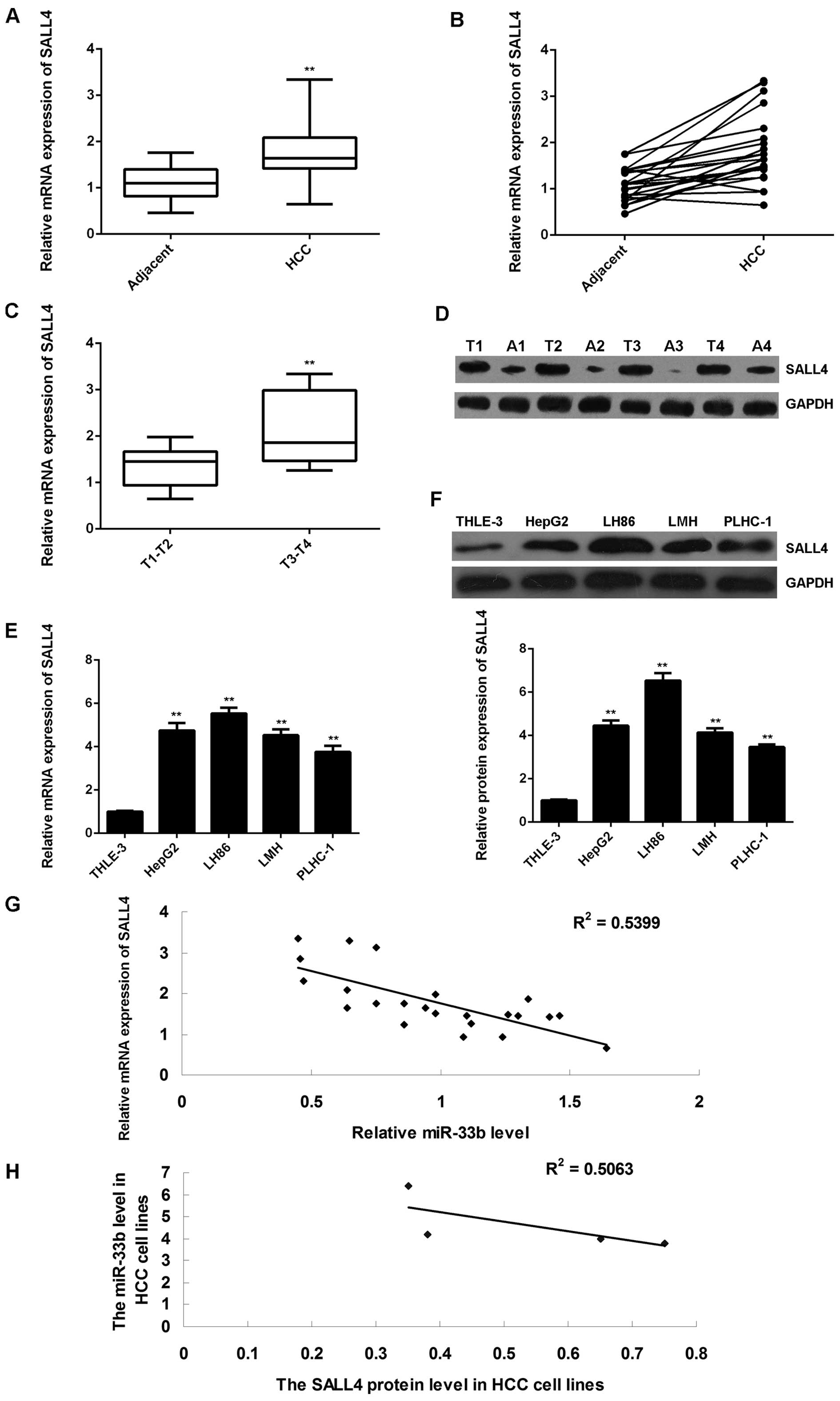 The role, as well as the regulatory mechanisms of miR-33b have not been previously been investigated in HCC, at least to the best of our knowledge. In the present study, we found that the expression of miR-33b was markedly reduced in HCC tissues and cell lines, when compared to the matched adjacent normal tissues and normal liver cell line. We further demonstrated that the overexpression of miR-33b suppressed the proliferation, migration and invasion of HCC cells by suppressing the protein expression of SALL4, which was significantly upregulated and inversely correlated with the miR-33b levels in HCC.