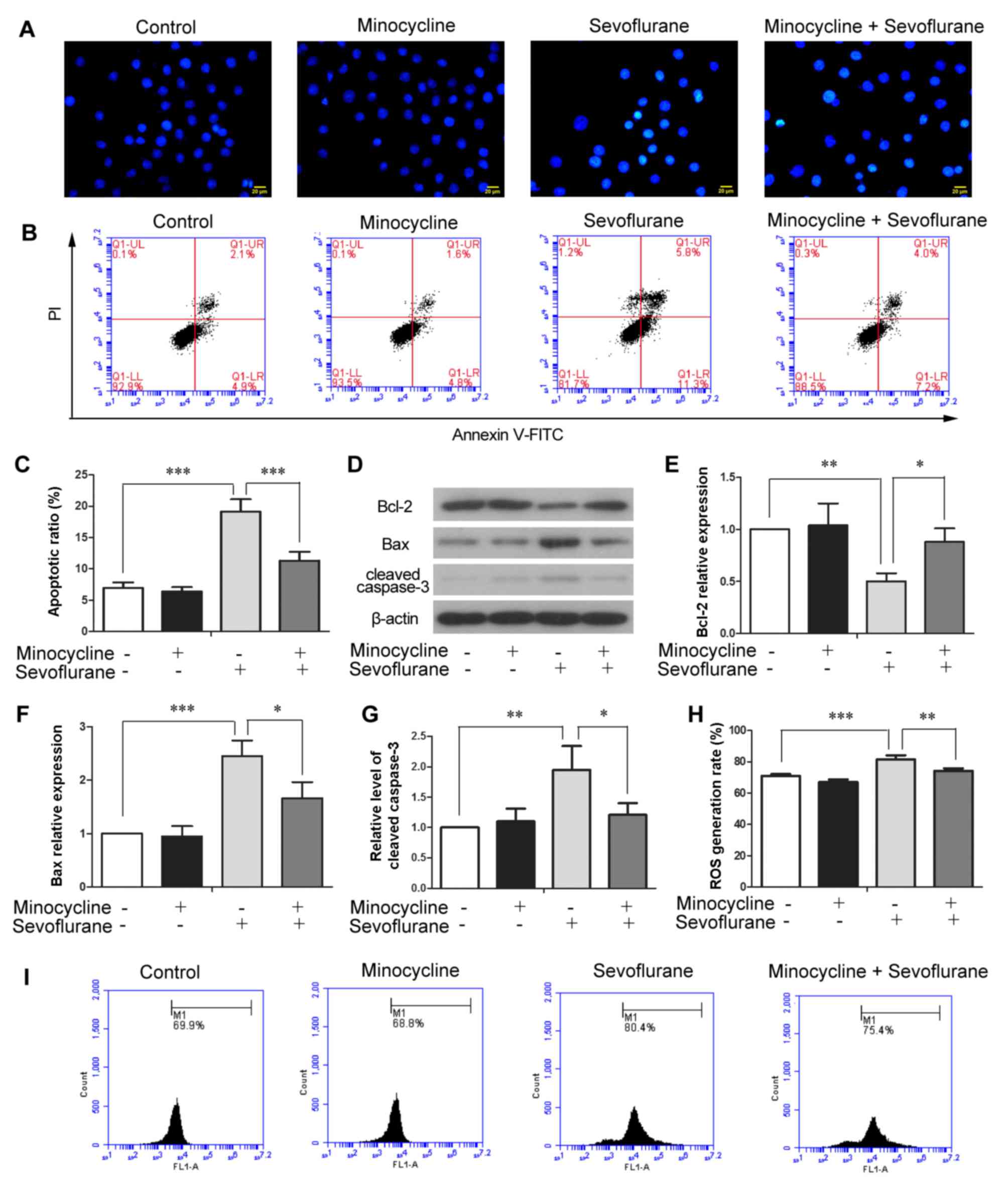 Minocycline, a second generation semi-synthetic derivative of tetracycline antibiotics, is mainly used in the treatment of infectious diseases in clinical practice. Minocycline can easily pass through the blood-brain barrier (BBB) (4), and has been demonstrated to attenuate neuronal cell death and improve the symptoms of neurodegenerative disorders in animal models (5,6). Recent studies have demonstrated that minocycline exerts neuroprotective effects by suppressing inflammation (7,8) and combating oxidative stress in the brain (9). Our group recently reported that minocycline attenuated sevoflurane-induced cognitive impairment in aged rats (10), suggesting that minocycline may be a promising agent which may be used to counteract anesthetic-induced neurotoxicity. Hence, in this study, we aimed to validate the cytoprotective effects of minocycline and to investigate the molecular mechanisms underlying the protective effects of minocycline against anesthetic-induced cytotoxicity. Hopefully, our study will shed some light on the discovery of more neuroprotective agents for the prevention and treatment of anesthetic-induced nervous system injury.