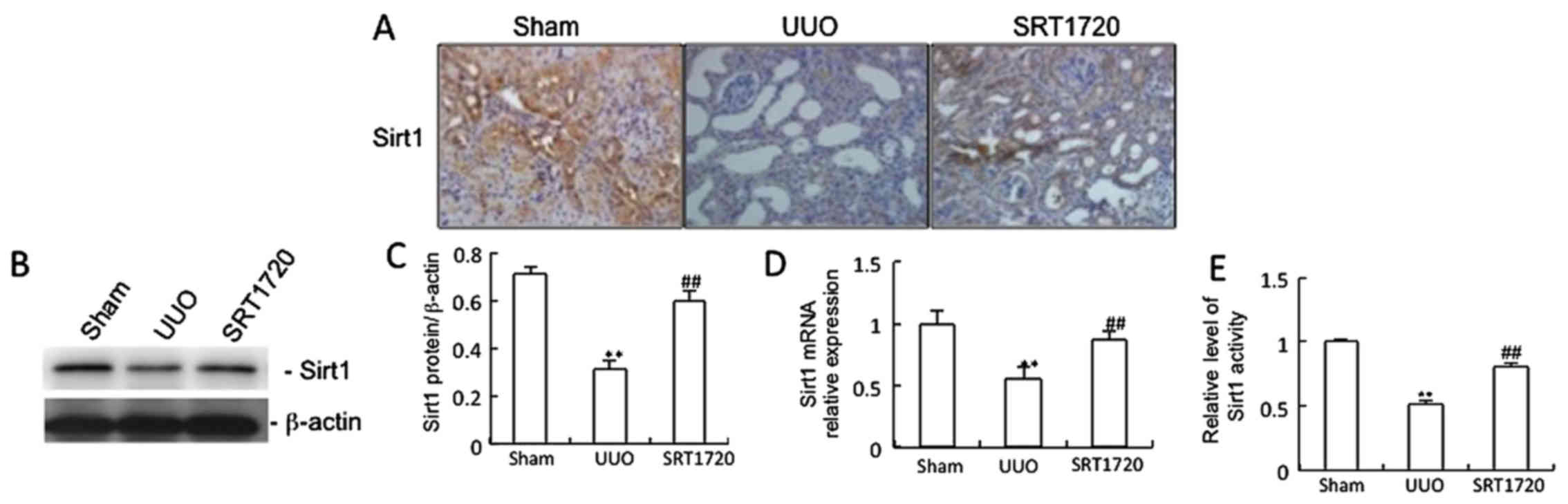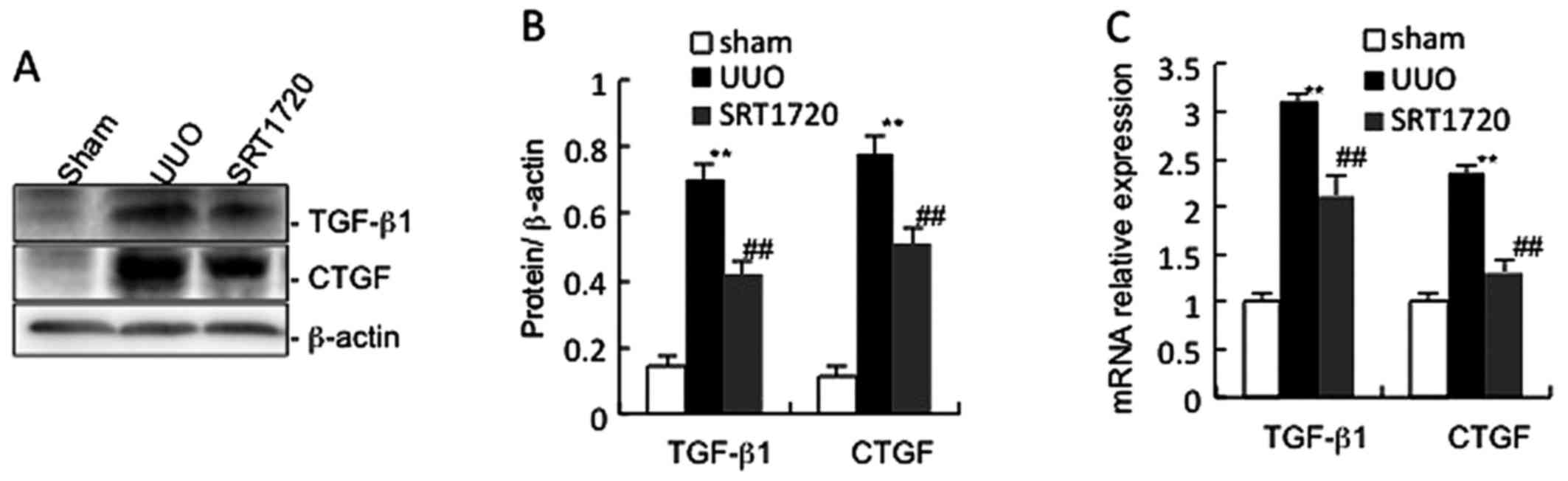 In the present study, to the best of our knowledge, we demonstrated for the first time that SRT1720 treatment decreased TGF-β1 production and CTGF activation in kidney tissues obtained from mice subjected to UUO. In addition, SRT1720 treatment reversed the oxidative stress induced by UUO.