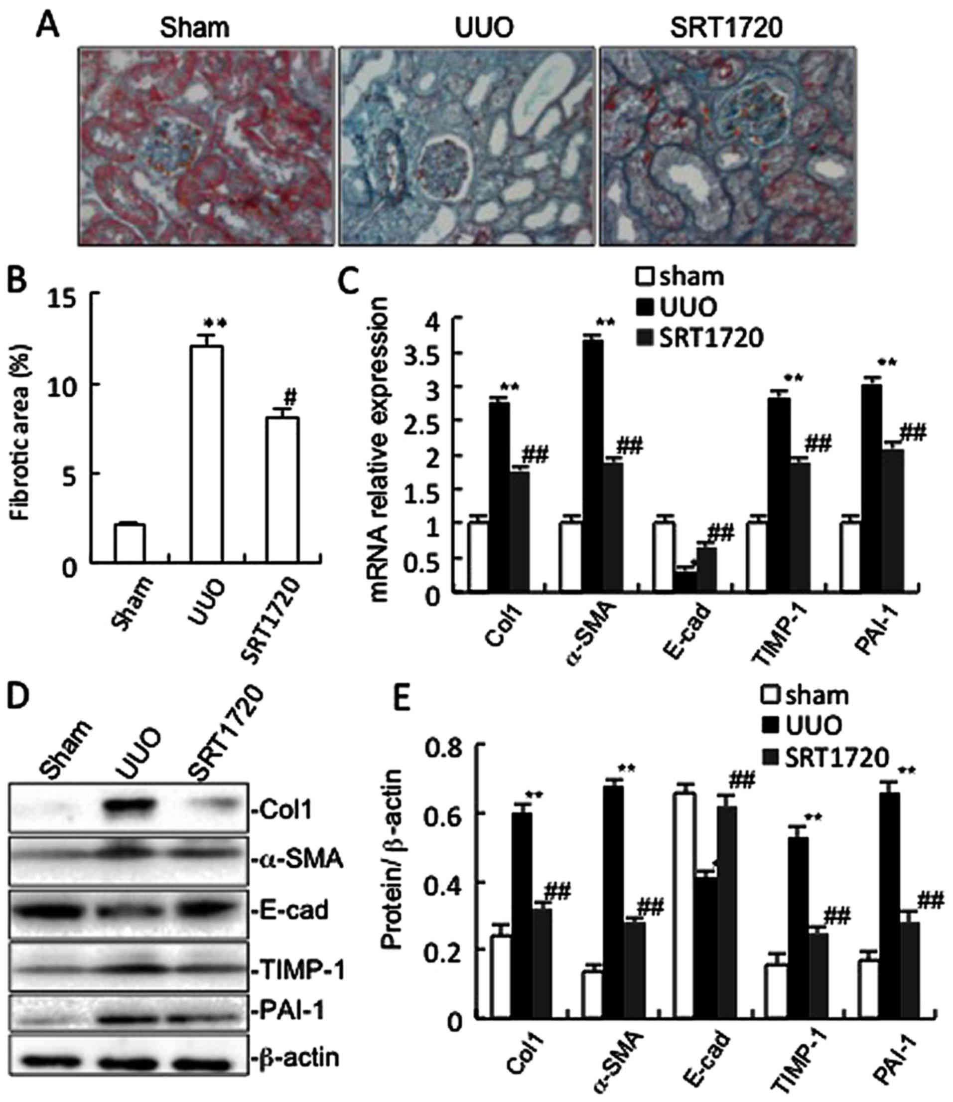 Renal fibrosis, whether the origin is inflammatory or immunological, obstructive, metabolic or systemic, inevitably progresses to end-stage renal disease with a progressive, irreversible decline in renal function. Therefore, the regulation of the renal fibrotic process provides new insight into the treatment and prevention of chronic kidney disease. The present study demonstrated that Sirt1 deficiency accentuated renal tubular cell apoptosis and tubulointerstitial fibrosis. Conversely, the Sirt1 activator, SRT1720, promoted the resistance of renal cells to oxidative stress during UUO. One of the primary mechanisms by which SRT1720 mediates its protective effects in the kidneys was by inhibiting TGF-β1/CTGF expression.