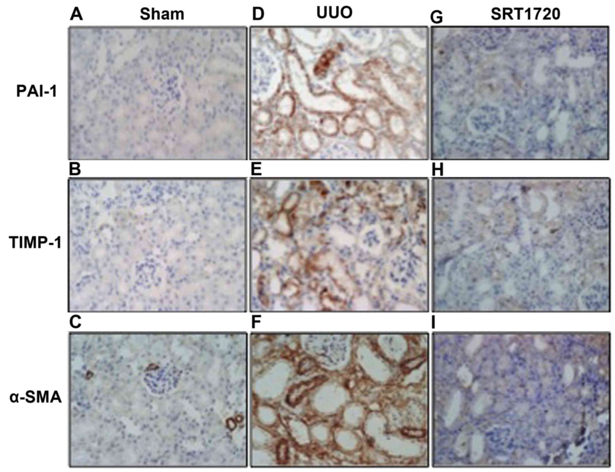 A variety of cytokines are known to affect the process of interstitial fibrosis, such as PAI-1 and TIMP-1 (15). Tubular EMT occurs when losing epithelial markers, such as E-cad, and acquiring mesenchymal ones, such as α-SMA (16). In this study, immunohistochemistry (Fig. 3) indicated that positive staining for PAI-1, TIMP-1 and α-SMA was mainly found in the tubular epithelial cells in the kidneys from the mice subjected to UUO. Moreover, our results demonstrated that the mRNA and protein levels of PAI-1, TIMP-1 and α-SMA all increased significantly in the obstructed kidneys of the mice in the UUO group compared to those of the sham group, as shown by western blot analysis and RT-qPCR (Fig. 2C–E). UUO led to decreased E-cad mRNA and protein expression. SRT1720 notably decreased the expression of α-SMA, PAI-1 and TIMP-1, and increased E-cad expression in the mice subjected to UUO (Fig. 2C–E).