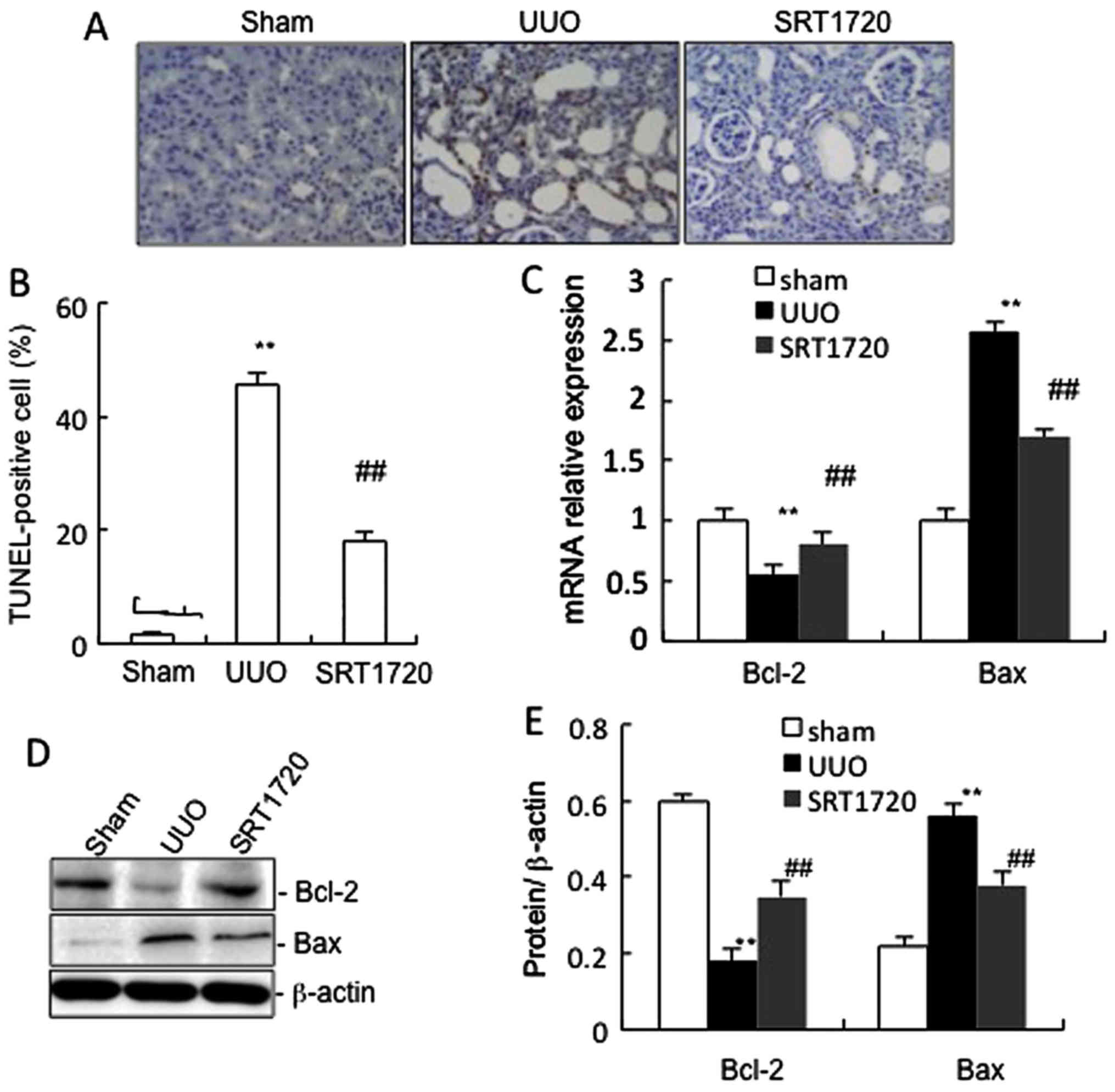 Fig. 4A and B present the number of TUNEL-positive tubular epithelial cells in the mice subjected to UUO and treated with or without SRT1720. UUO significantly increased tubular epithelial cell apoptosis, which was markedly decreased by the delivery of SRT1720, compared with the sham-operated mice. Furthermore, in the obstructed kidneys from the mice in the UUO group, 7 days of UUO resulted in a significant decrease in the protein and mRNA expression of Bcl-2, and in an increase in Bax expression compared with the sham-operated group. SRT1720 administration attenuated the changes in Bcl-2 and Bax expression (Fig. 4C–E).
