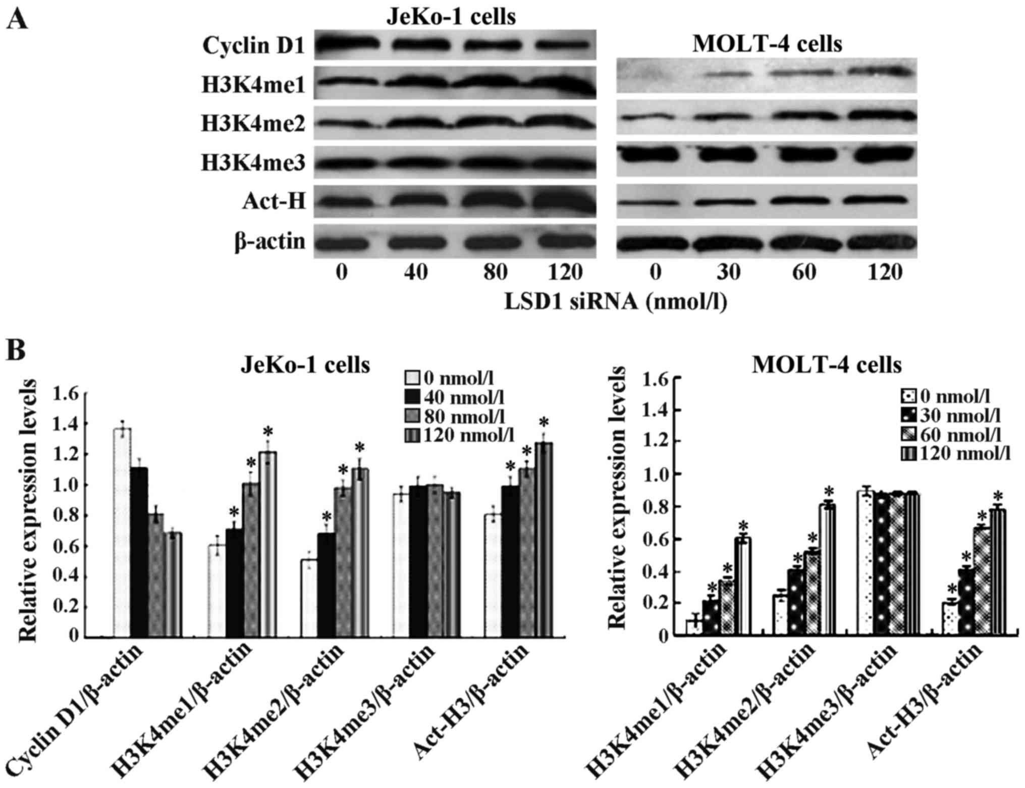 To examine our hypothesis, siRNA LSD1 was used to silence LSD1 gene expression, and this was found to upregulate methylated H3K4me1 and H3K4me2 in the JeKo-1 and MOLT-4 cells. The effect on histone lysine methylation was examined by immunocytochemistry using an antibody against H3K4me1 and H3K4me2. Following transfection of the JeKo-1 cells with LSD1 siRNA at 40, 80 and 120 nmol/l for 24 h, the expression of H3K4me1 was increased 1.18-, 1.66- and 2.01-fold, respectively compared to the untreated cells. The expression of H3K4me2 was increased 1.22-, 1.73- and 2.03-fold, respectively compared to the untreated cells. However, the expression of histone trimethylated H3K4me3 was not altered significnatly (Fig. 6). The effects of siRNA LSD1 in the MOLT-4 cells were similar as those observed in the JeKo-1 cells (Fig. 6). These data indicate that LSD1 is probably a H3K4me1 and H3K4me2 demethylase. LSD1 siRNA increased the histone acetylation of H3 in the JeKo-1 and MOLT-4 cells. At 24 h following transfection with LSD1 siRNA, the expression of histone acetylation H3 increased 1.25-, 1.42- and 1.56-fold. As MCL is characterized by carrying the t(11;14) (q13;q32) translocation that leads to the overexpression of cyclin D1, we further examined the effects of siRNA LSD1 on cyclin D1. The expression of cyclin D1 was decreased 0.79-, 0.5- and 0.49-fold following transfection with siRNA LSD1 at the indicated concentrations (Fig. 6).