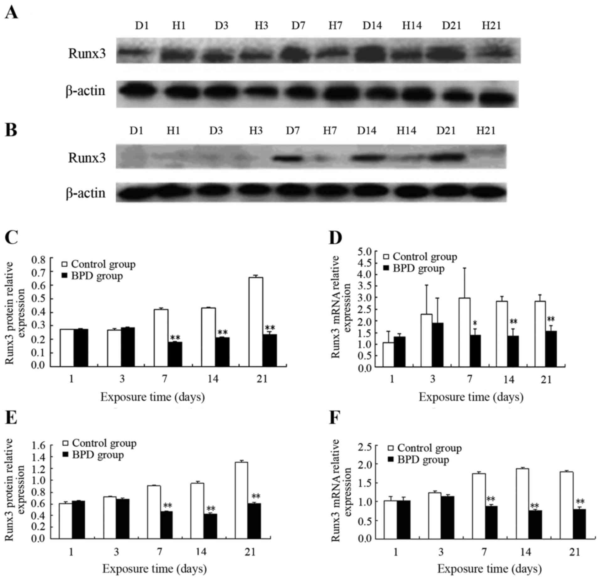 On days 1 and 3, the protein expression level of Runx3 in lung tissue did not differ significantly between the 2 groups. On day 7, Runx3 protein expression in the control group remained high, while Runx3 protein expression progressively decreased in the BPD group. On days 7, 14 and 21, the protein expression level of Runx3 in the control group was significantly higher than that in the BPD group (P<0.01) (Fig. 1A and C). Similarly, no significant difference in Runx3 mRNA expression was observed between the 2 groups on days 1 or 3, while the Runx3 mRNA expression level was significantly higher in the control group than in the BPD group on days 7, 14 and 21 (P<0.01) (Fig. 1D).