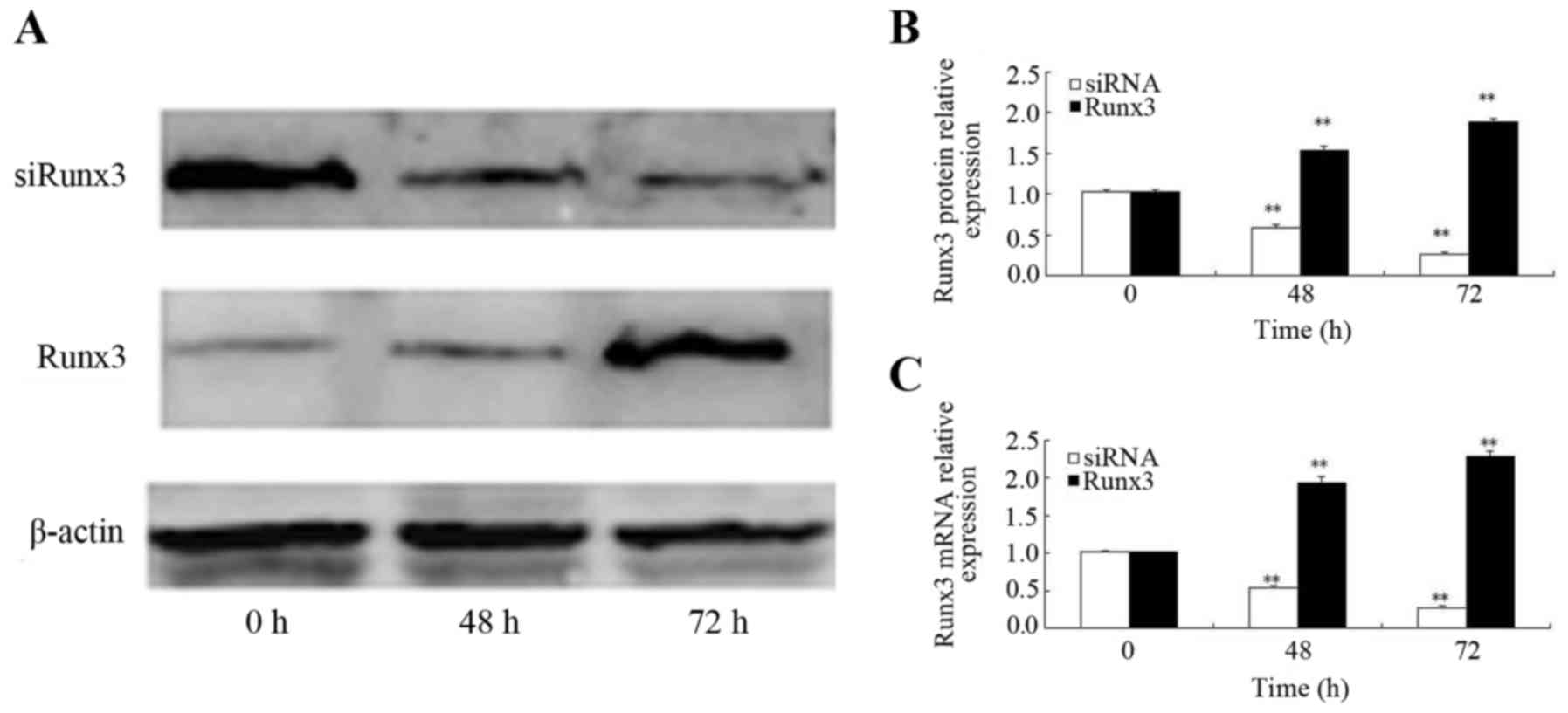 At 48 h following transfection with the Runx3 plasmid, the increased mRNA expression of Runx3 was observed; Runx3 mRNA expression was higher at both 48 and 72 h post-transfection as compared to time 0 (P<0.01) (Fig. 2B). Similarly, the Runx3 protein expression level increased beginning at 48 h post-transfection and it was also significantly higher at 48 and 72 h post-transfection as compared to time 0 (P<0.01) (Fig. 2A and C). At 48 h following transfection of the cells with siRNA, Runx3 mRNA expression was decreased; Runx3 mRNA expression 24, 48 and 72 h post-siRNA transfection was lower than that at time 0 (P<0.01) (Fig. 2B). Similarly, the Runx3 protein expression level began to decrease beginning at 48 h post-siRNA transfection and it remained lower at 48 and 72 h post-transfection than at time 0 (P<0.01) (Fig. 2A and C).