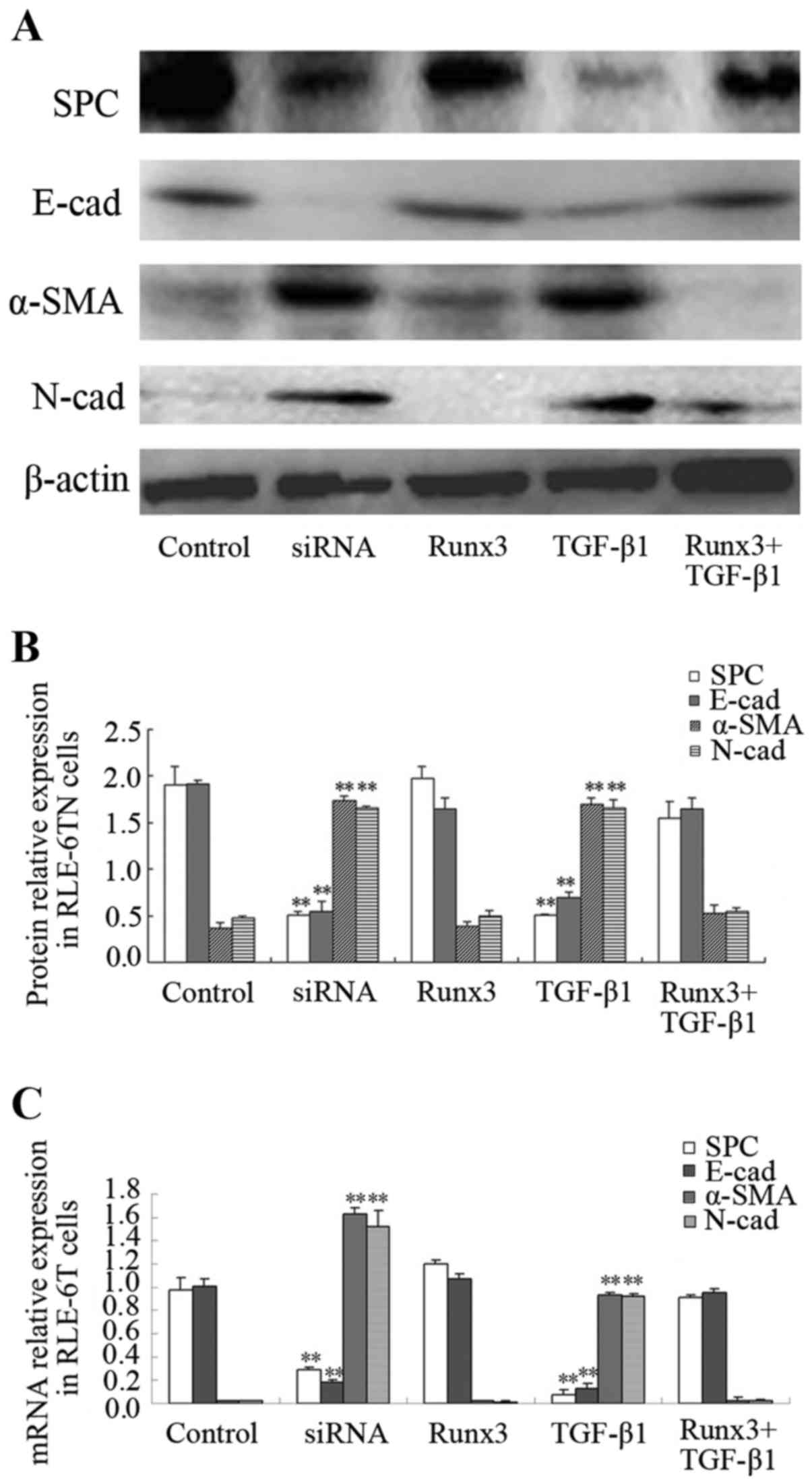 The protein expression of SPC, α-SMA, E-cad and N-cad in the 5 RLE-6TN cell groups was measured. The protein expression levels of the mesenchymal cell markers, α-SMA and N-cad, in the TGF-β1 and siRunx3 groups were significantly higher than those in the control group (P<0.01; Fig. 3A and B), while the protein expression levels of the epithelial cell markers, SPC and E-cad, were significantly lower than those in the control group (P<0.01; Fig. 3A and B). No significant differences in either the epithelial or the mesenchymal cell markers were found between the Runx3 overexpression group or the Runx3 + TGF-β1 group and the control group (Fig. 3A and B). Similarly, the mRNA expression levels of α-SMA and N-cad in the TGF-β1 group and siRunx3 group were significantly higher than those in the control group (P<0.01; Fig. 3C), while the mRNA expression levels of SPC and E-cad were significantly lower than those in control group (P<0.01; Fig. 3C). No significant differences in either the epithelial cell markers or the mesenchymal cell markers were found between the Runx3 overexpression group or the Runx3 + TGF-β1 group and the control group (Fig. 3C).