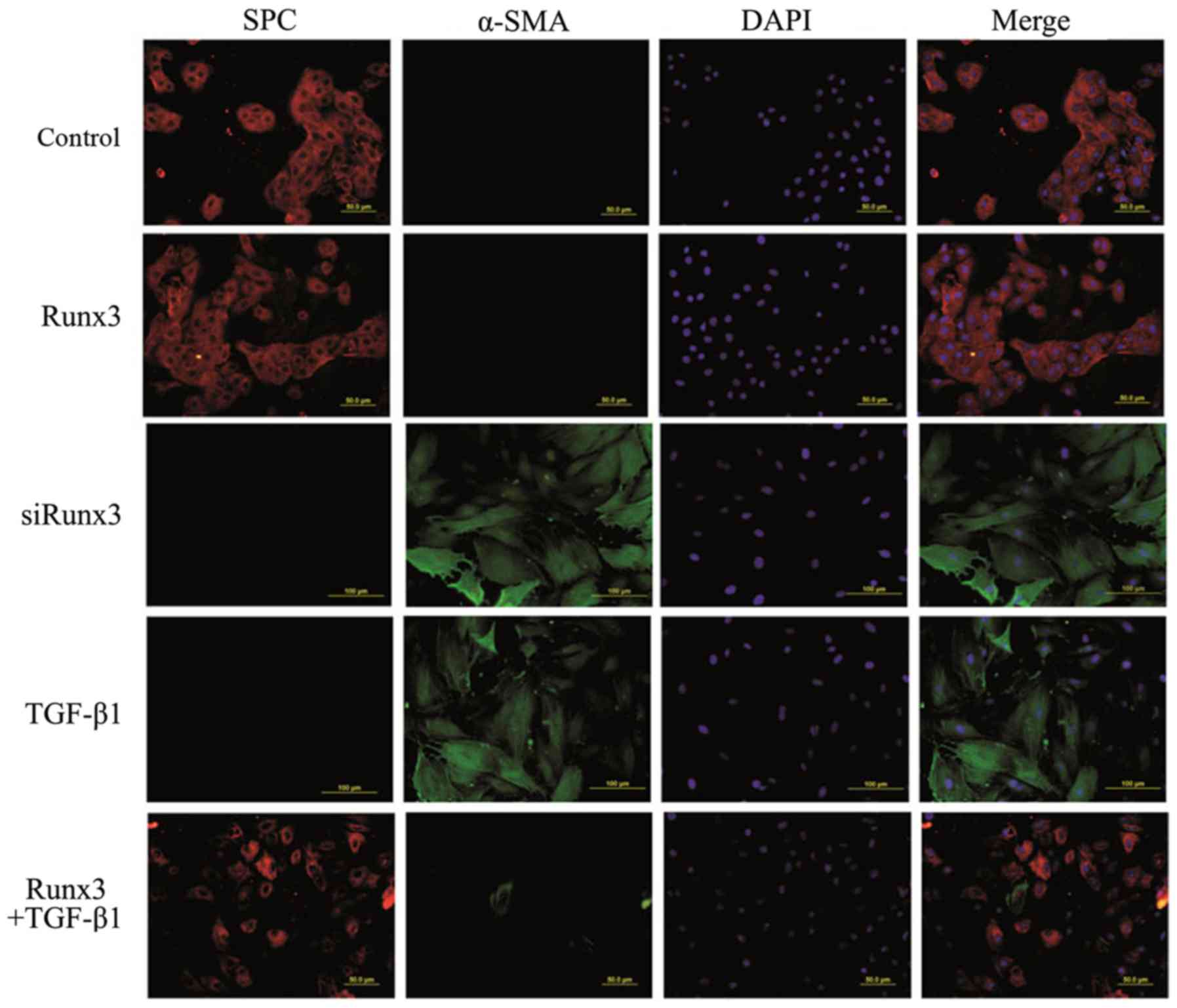 SPC is a specific marker of AT2 cells, while α-SMA is a marker of mesenchymal cells; their co-expression suggests EMT occurrence in RLE-6TN cells. Using two-color immunofluorescence staining we found that in both the control group and the Runx3 group, SPC was expressed in the cytoplasm (red fluorescence), while the expression of α-SMA was not detectable (green fluorescence). In the TGF-β1 group and the siRunx3 group, SPC expression was not observed, yet α-SMA expression was detectable in the cytoplasm. However, in the Runx3 + TGF-β1 group, a large amount of SPC expression and a trace amount of α-SMA expression were found (Fig. 4).