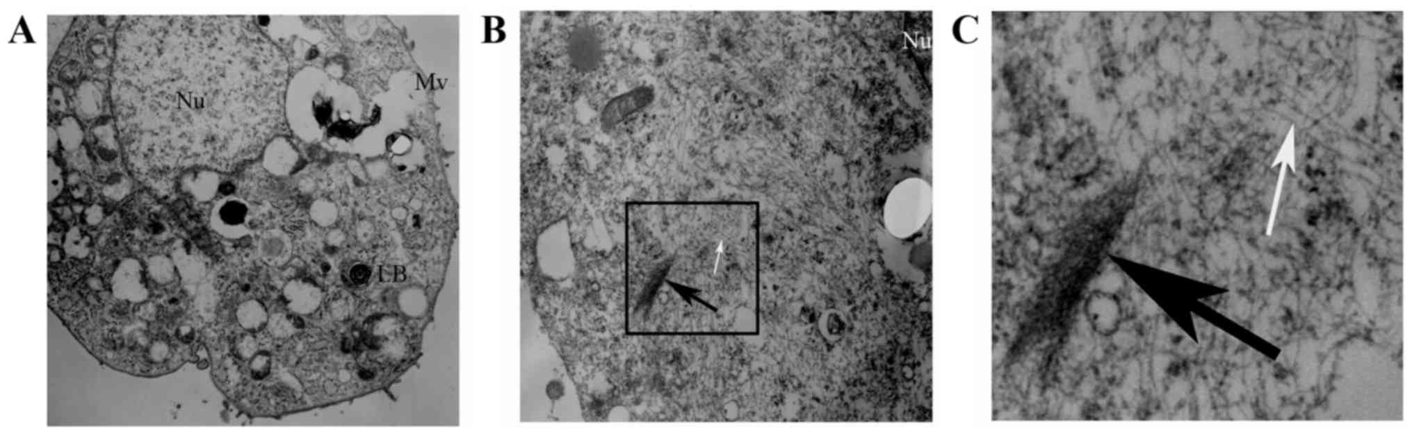 The RLE-6TN cells collected, respectively from the 5 different groups were fixed in PBS solution (pH 7.4) containing 2.5% glutaraldehyde for 2 h, washed with PBS 3 times, post-fixed in 1% osmium tetroxide for 2 h, washed with distilled water 3 times, dehydrated with gradient ethanol and acetone, and immersed in Epon 812 overnight; the lung tissue blocks were then embedded in Epon 812 and cut into ultrathin sections (60 nm). The ultrathin sections were double-stained with uranyl acetate and aluminum citrate and cellular morphology was observed under a transmission electron microscope (Hitachi H-7650; Hitachi Co., Tokyo, Japan).