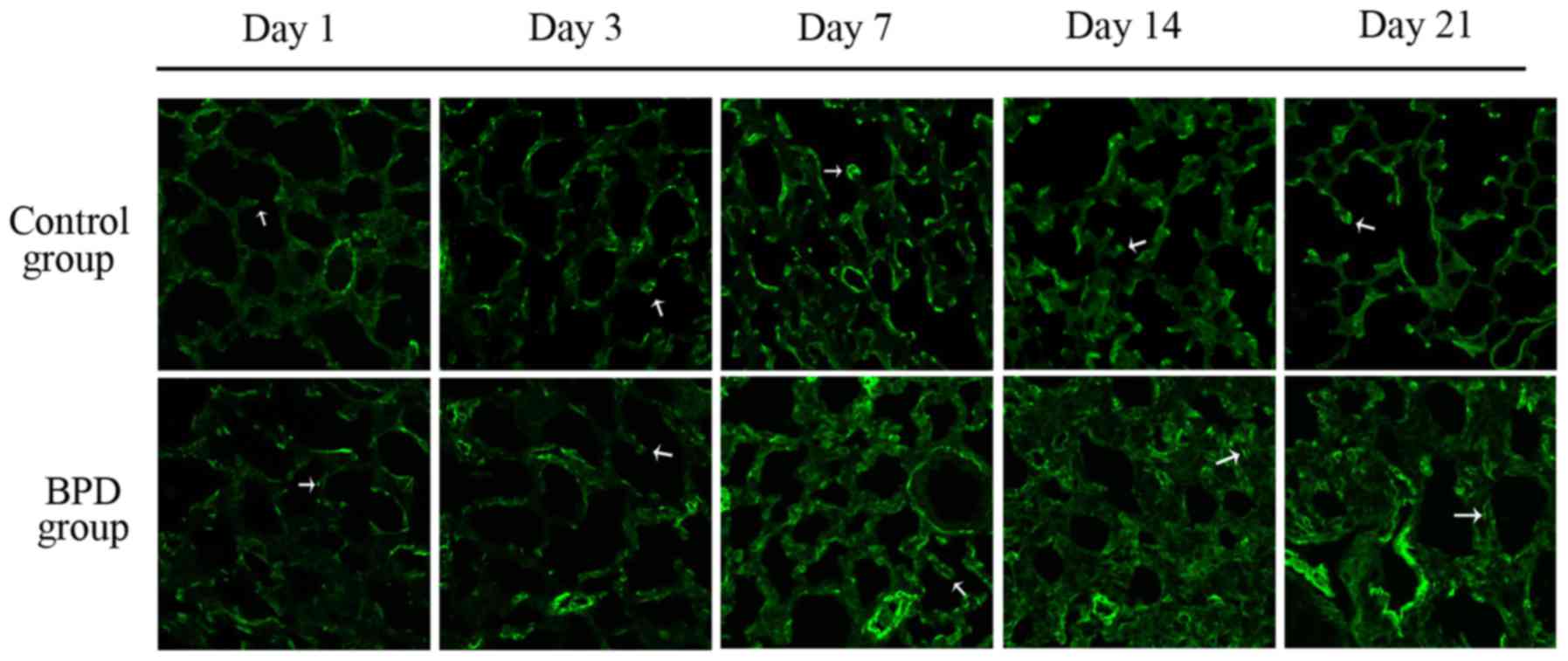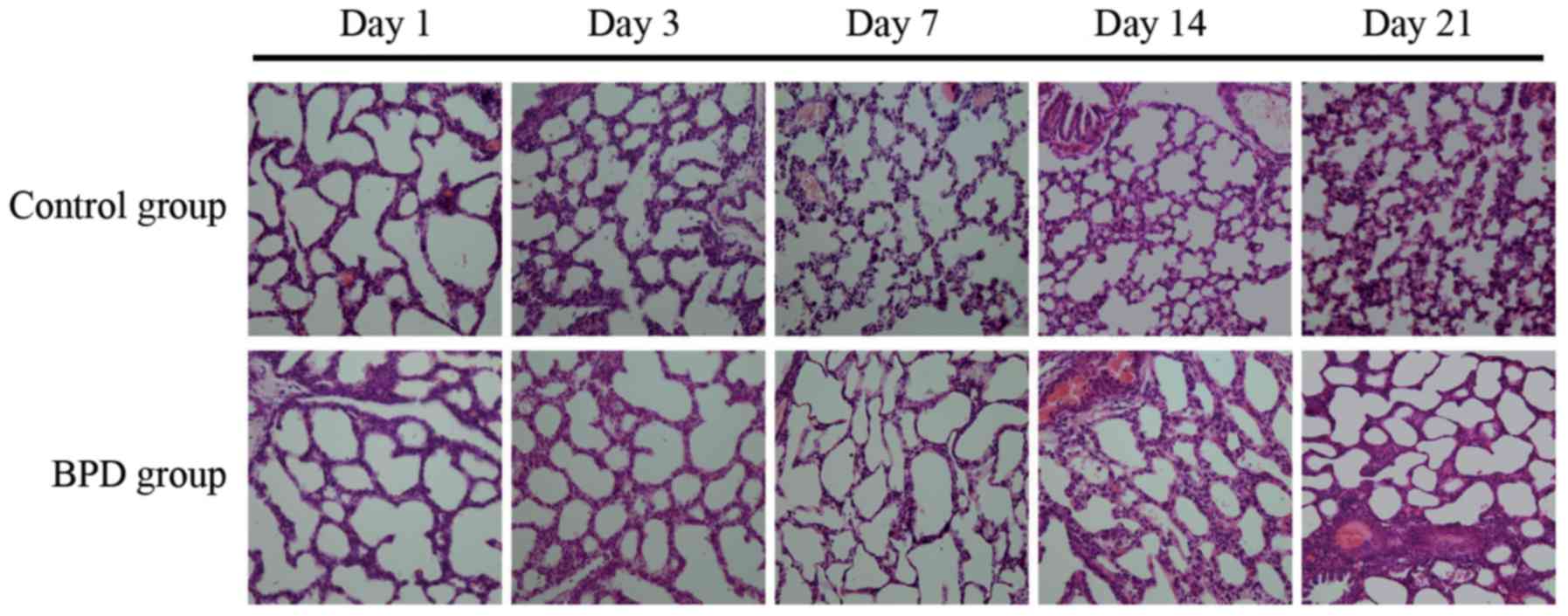 Animal models of BMD were established as previously described (17). Pregnant Wistar rats with a body weight of 200–220 g were purchased from the Experimental Animal Center of China Medical University. Each pregnant Wistar rat was fed independently and gave birth naturally at 22 days of gestation. Newborn rats were randomly allocated to either the BPD model group (n=80) or the control group (n=80) within 12 h after birth. Newborn rats in the BPD model group were placed in a plexiglass oxygen tank and subjected to 95% oxygen inhalation for 1 to 21 days; an oxygen analyzer was used to continuously monitor the oxygen concentration. The tank was opened for 10 min and nursing rat dams were switched every 24 h between the hyperoxia and normoxia tanks to avoid oxygen toxicity. Newborn rats in the control group inhaled fresh air as opposed to hyperbaric oxygen; however, all other experimental conditions and control factors were the same as those for the BPD model group. Eight animals were euthanized and lung tissue was collected at each time-point (1, 3, 7, 14 and 21 days). The left lungs were fixed in 4% paraformaldehyde for hematoxylin and eosin (H&E) staining and immunofluorescence assay. The right lungs were preserved in liquid nitrogen for mRNA detection and western blot analysis. All animal procedures were evaluated and approved by the Experimental Animal Ethics Committee of China Medical University, Shenyang, China.