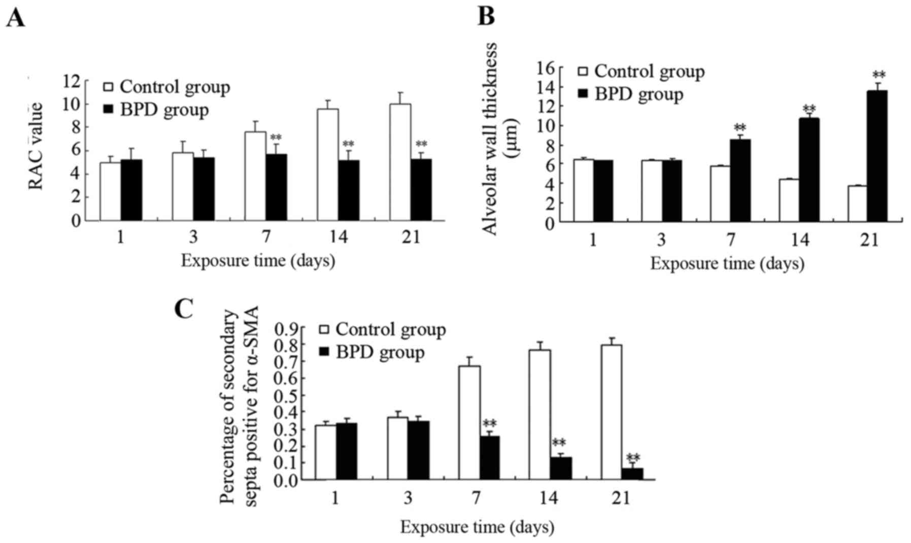 The sections were stained with H&E. Morphological changes were assessed using an optical microscope (x40 magnification; Fig. 6). On days 1 and 3, there was no significant difference in the RAC between the 2 groups; however, on days 7, 14 and 21, the RAC of the control group was significantly greater than that of the BPD group (P<0.01; Fig. 7A). On days 7, 14 and 21, the alveolar wall thickness in the BPD group was significantly greater than that in control group (P<0.01; Fig. 7B). On days 1 and 3, α-SMA expression in the lung tissues did not differ significantly between the 2 groups; α-SMA was primarily expressed at the top of secondary septa in the control group samples, but was expressed in the pulmonary mesenchyma in the BPD samples beginning on day 7. On days 7, 14 and 21 the percentage of α-SMA-positive secondary septa in the control group was markedly higher than that in the BPD group (Figs. 7C and 8).