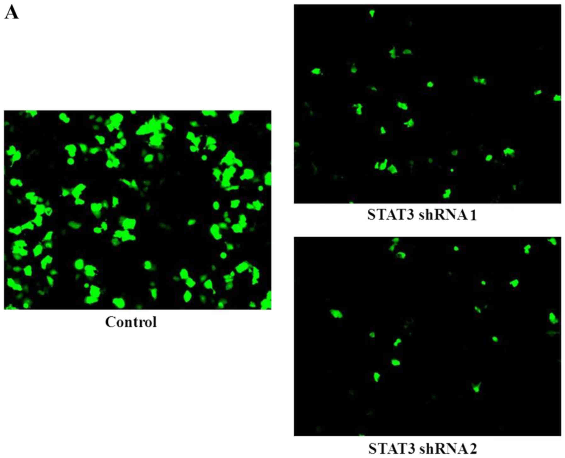Two STAT3 shRNAs with green fluorescent protein (GFP) obtained from Qiagen (Valencia, CA, USA) (cat. no. 336311) were used to knock down STAT3 as shRNA1 and shRNA2. Transfections in TW01 and TW06 cells were performed using PolyJet™ reagent (SL100688; SignaGen® Laboratories, Rockville, MD, USA) according to the manufacturer's protocol. After 24 h of transfection, the cells were processed for anoikis assay, invasion assay or western blotting, as described above. Prior to the experiment, the extent of silencing was tested by western blotting.