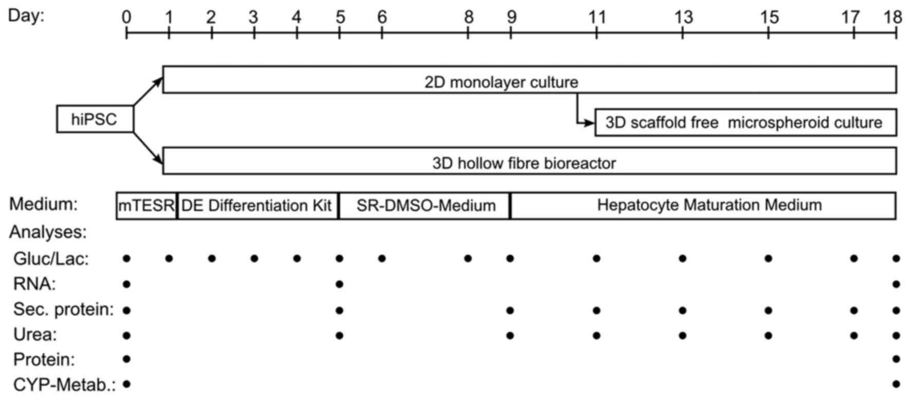 In the present study, the authors investigated the hepatic differentiation of human iPSCs (hiPSCs) in two different 3D culture systems, a scaffold-free microspheroid culture system and a 3D hollow-fiber perfusion bioreactor (31). The differentiation outcome in these 3D systems was compared with that in conventional 2D cultures. All culture systems were treated with the same differentiation protocol, allowing a comparative analysis of the generated HLCs at mRNA, protein and metabolic level. In addition, data from hiPSC-derived differentiated cells were compared to those from PHH. Based on the results, promising approaches for the development of physiologically relevant in vitro liver models were identified.
