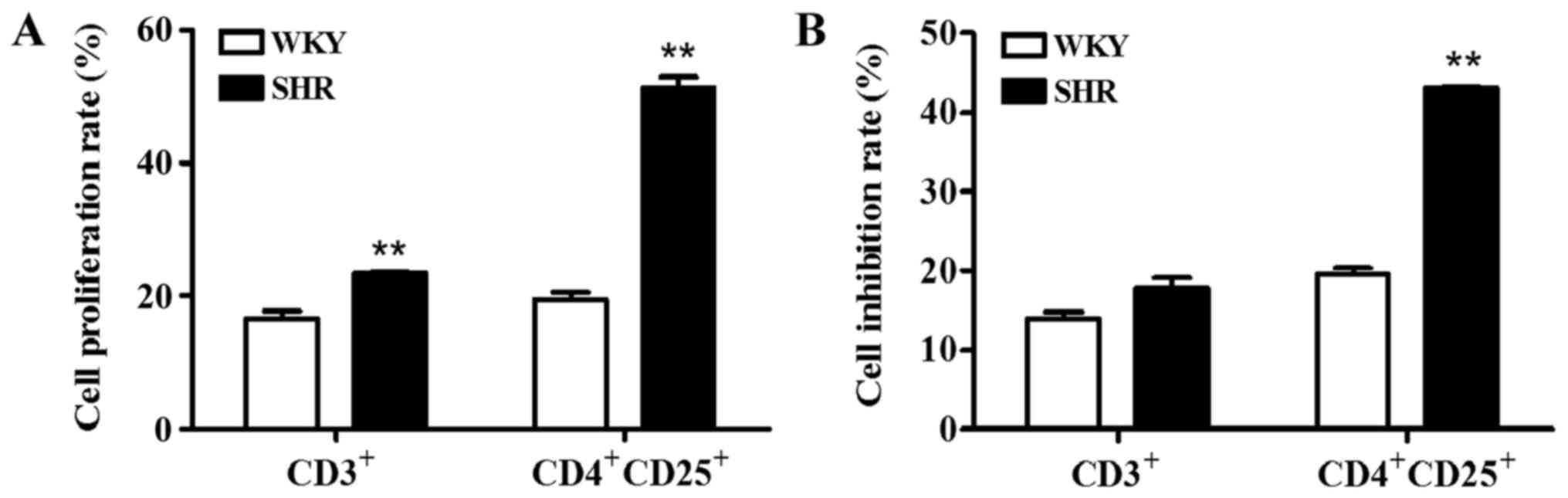 We investigated whether pro-inflammatory lymphocytes can be detected in the spleens of normotensive and hypertensive rats. Flow cytometric analysis (Fig. 3) was used to determine the percentages of CD3+ T cells (WKY, 41.8±1.0%; SHR, 41.5±1.6%; p>0.05), CD3+CD4+ T cells (WKY, 52.5±1.4%; SHR, 54.9±0.7%; p>0.05), CD3+CD8+ T cells (WKY, 37.2±0.7%; SHR, 36.2±0.9%; p>0.05) and CD4+CD25+ T cells (WKY, 4.9±0.1%; SHR, 2.6±0.1%; p<0.01), as well as the ratio of CD4+/CD8+ (WKY, 1.47±0.02; SHR, 1.52±0.03; p>0.05) cells. The frequencies of CD4+CD25+ T cells were significantly lower in the spleens of SHRs as compared with those of the WKY rats. The percentage of other T cell subtypes, including the CD3+, CD3+CD4+, and CD3+CD8+ T cells in the spleen and the CD4+/CD8+ ratio did not differ significantly between the SHRs and WKY rats. These results demonstrated that a population of Tregs may be required for hypertension.