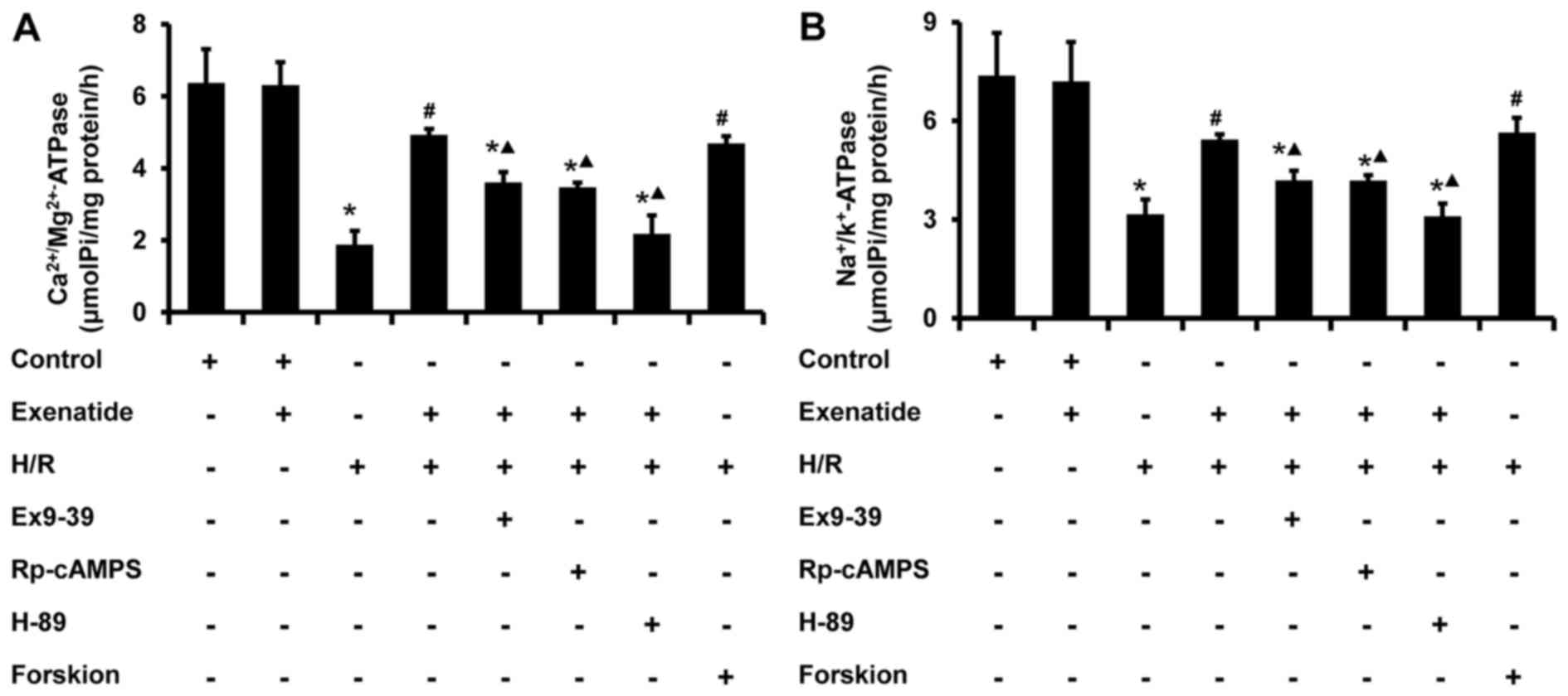 The activity of mitochondrial ATPase was further examined. As shown in Fig. 8, H/R-treated cells exhibited a significant decrease in the activity of Na+/K+ ATPase (P<0.05) and Ca2+/Mg2+ ATPase (P<0.05), whereas exenatide pretreat ment significantly increased the activity of Na+/K+ ATPase (P<0.05) and Ca2+/Mg2+ ATPase (P<0.05) in H/R-treated cells; these results were similar to those in the H/R + forskolin group. The effects of exenatide on ATPase in mitochondria were also inhibited by exendin-(9-39), Rp-cAMPS and H-89 (P<0.05). These findings provide evidence that exenatide maintains mitochondrial ATPase activity during H/R via activating the GLP-1 receptor/cAMP/PKA pathway.