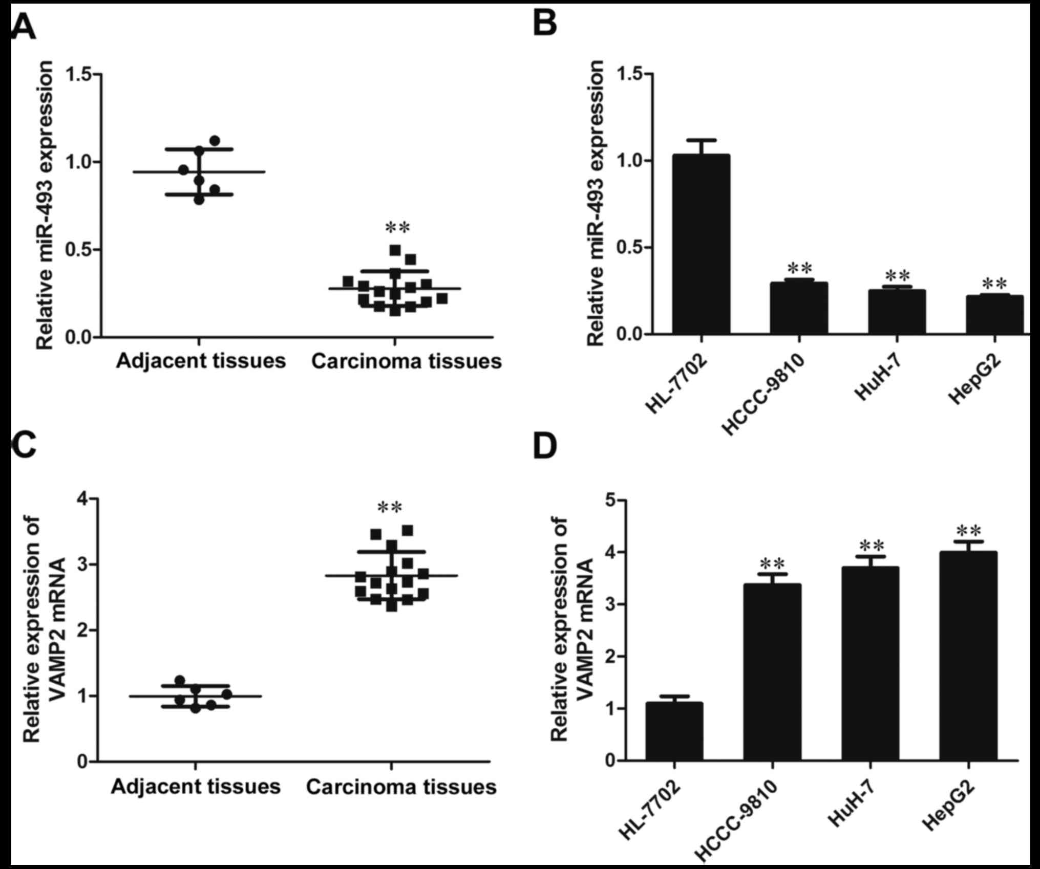 The present study investigated the expression of miR-493-5p in liver cancer tissues and cell lines, and explored the effect of miR-493-5p on the biological behavior of the HepG2 cell line. Furthermore, whether the expression of vesicle associated membrane protein 2 (VAMP2) is regulated by miR-493-5p was also explored. The results of these investigations may provide a new method or strategy for the therapy of liver cancer.