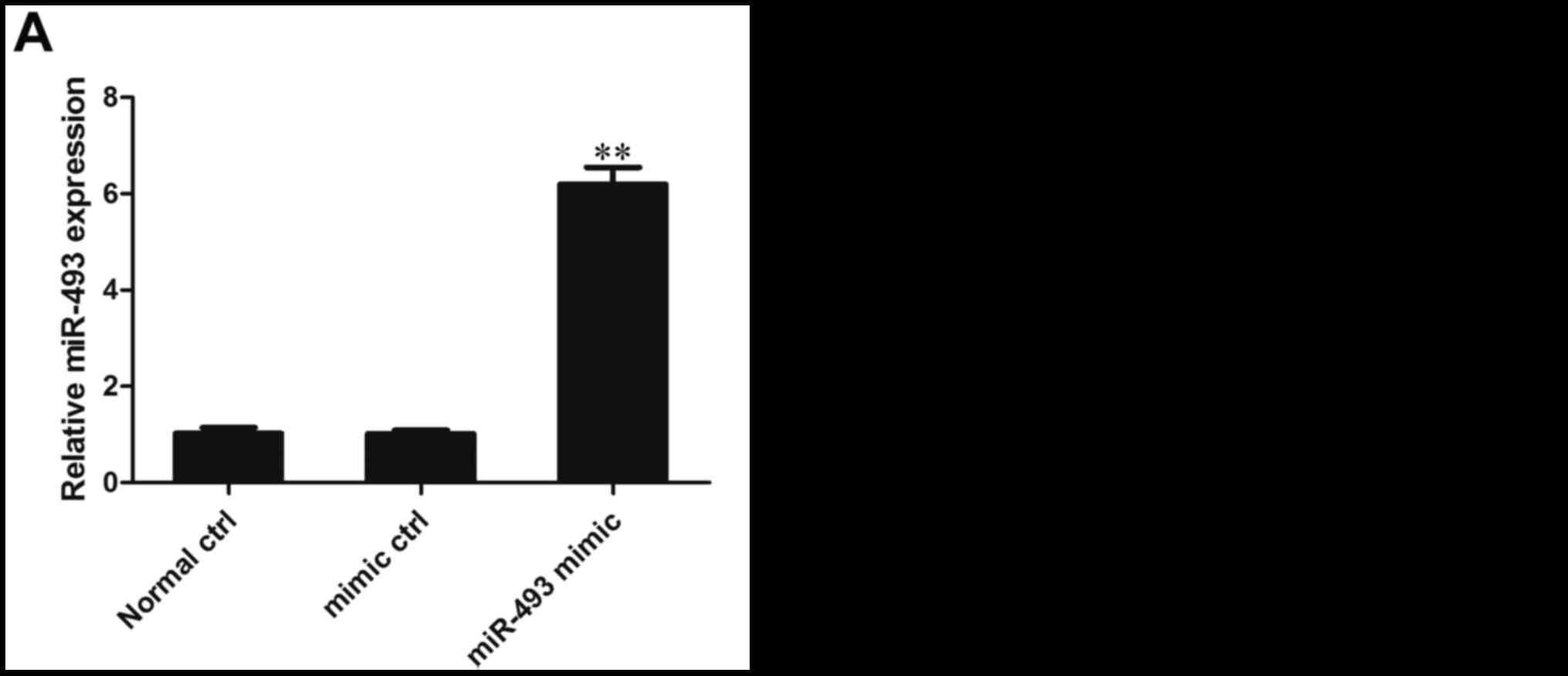 The TaqMan miRNA isolation kit and TaqMan microRNA assay kit were purchased from Applied Biosystems (Thermo Fisher Scientific, Inc., Waltham, MA, USA). The primers for miR-493-5p were: 5′-TCC TAC GGA GAG GCT CAG-3′ and 5′-TCC TCG TAG TCC AAC ACG-3′. The miR-493-5p mimic and negative control (mimic control) were synthesized by Shanghai GenePharma Co., Ltd. (Shanghai, China).