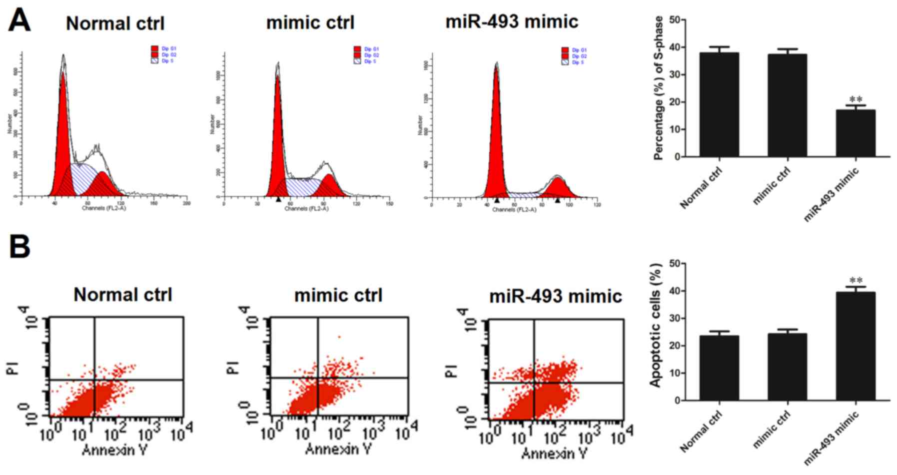 The HepG2 cell line was transfected with miR-493-5p mimic or negative control and 48 h later, the cells were subjected to flow cytometric analysis of the cell cycle and apoptosis. The percentage of cells in the S phase was determined relative to the total number of cells in the G0/G1, S and G2M phases. The flow cytometric analysis demonstrated that the percentage of cells in the S phase in the miR-493-5p mimic transfection group was significantly smaller compared with that in the normal control and negative control groups (both P<0.01; Fig. 3A). On the basis of these results, it may be speculated that miR-493-5p is an inhibitor of HepG2 cell replication. Analysis of cell apoptosis indicated that the proportion of apoptotic cells in the miR-493-5p mimic transfection group was significantly greater than that in the normal control and negative control groups (both P<0.01; Fig. 3B). This assay indicates that miR-493-5p promoted cell apoptosis.