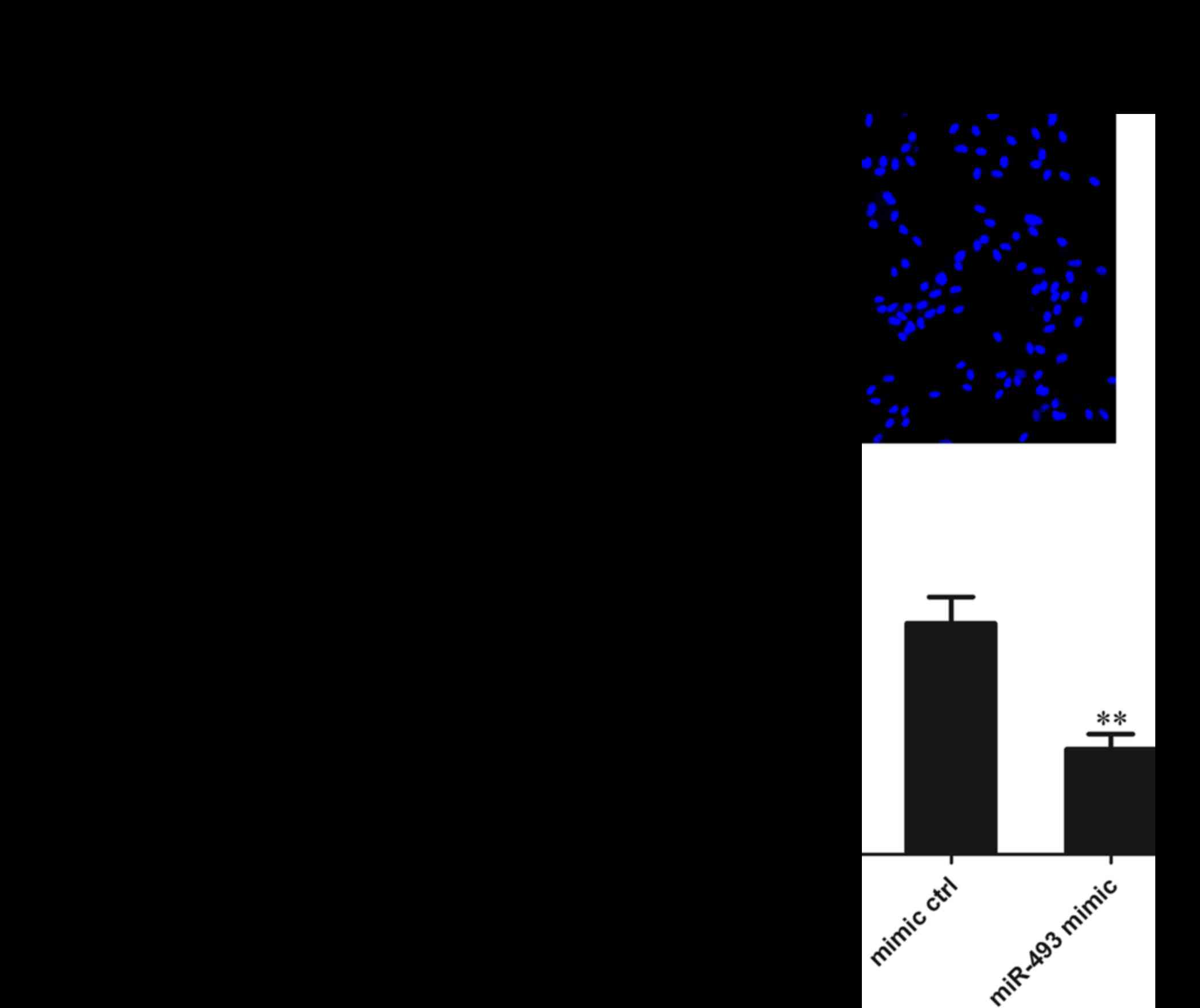 The HepG2 cells were transfected with miR-493-5p mimic or negative control and 48 h later, they were subjected to Transwell invasion experiments. The results of Hoechst 33342 staining revealed that the number of cells migrating through the polycarbonate membrane in the miR-493-5p mimic transfection group was significantly reduced compared with that in the mimic and normal control groups (both P<0.01). These results suggest that miR-493-5p inhibits the migration of HepG2 cells (Fig. 4).