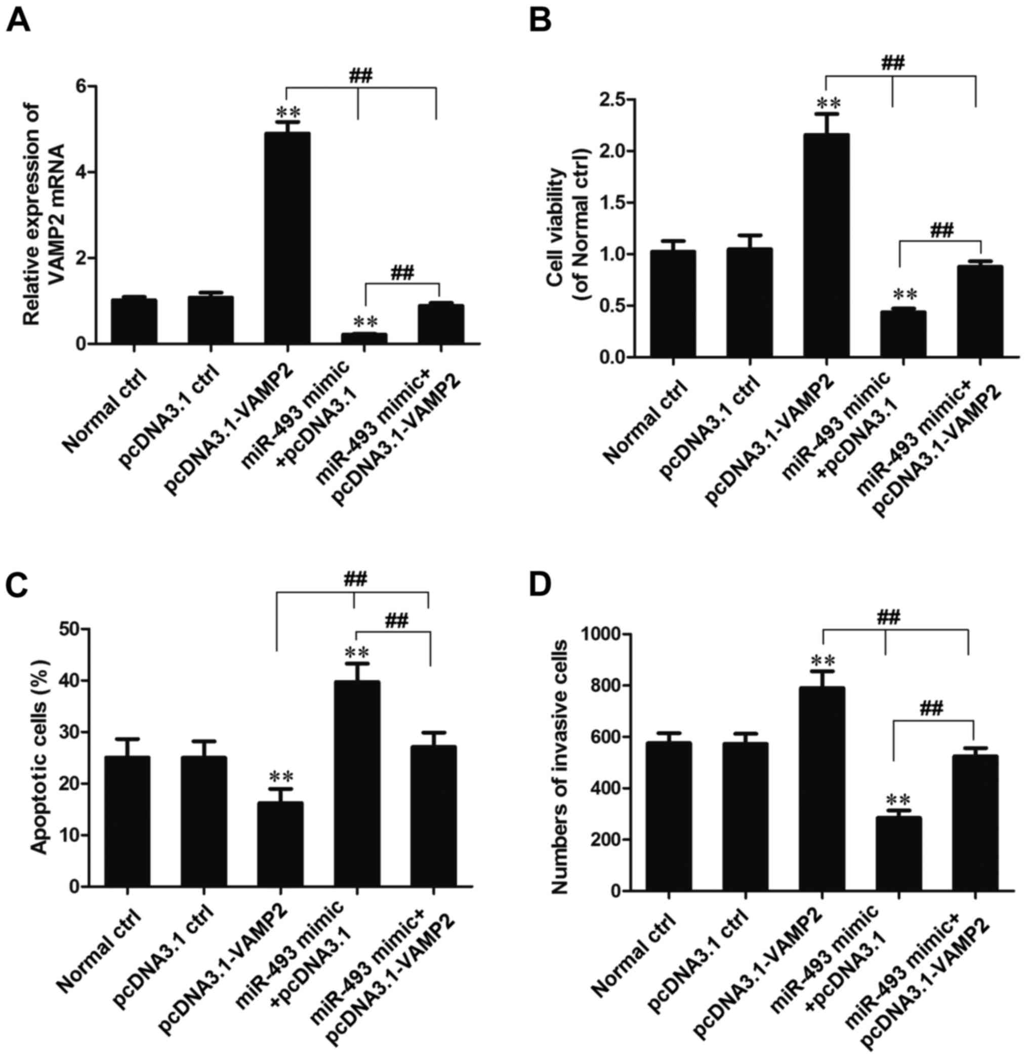 Analysis using MTT and Transwell experiments demonstrated that the cell viability and invasion ability of cells in the miR-493-5p mimic + pcDNA3.1-VAMP2 group was significantly lower than that in the pcDNA3.1-VAMP2 transfection group (P<0.01), significantly higher than that in the miR-493-5p mimic + pcDNA3.1 transfection group (P<0.01), and slightly lower than that in the normal control and pcDNA3.1 control groups (Fig. 6B and D). Flow cytometric analysis indicated that the percentage of apoptotic cells in the miR-493-5p mimic + pcDNA3.1-VAMP2 transfection group was significantly higher than that in the pcDNA3.1-VAMP2 transfection group (P<0.01), significantly lower than that in the miR-493-5p mimic + pcDNA3.1 transfection group (P<0.01) and slightly higher than that in the normal control and pcDNA3.1 control groups (Fig. 6C). These results indicate that the overexpression of VAMP2 reverses the effect of miR-493-5p as an inhibitor of proliferation and inducer of apoptosis.