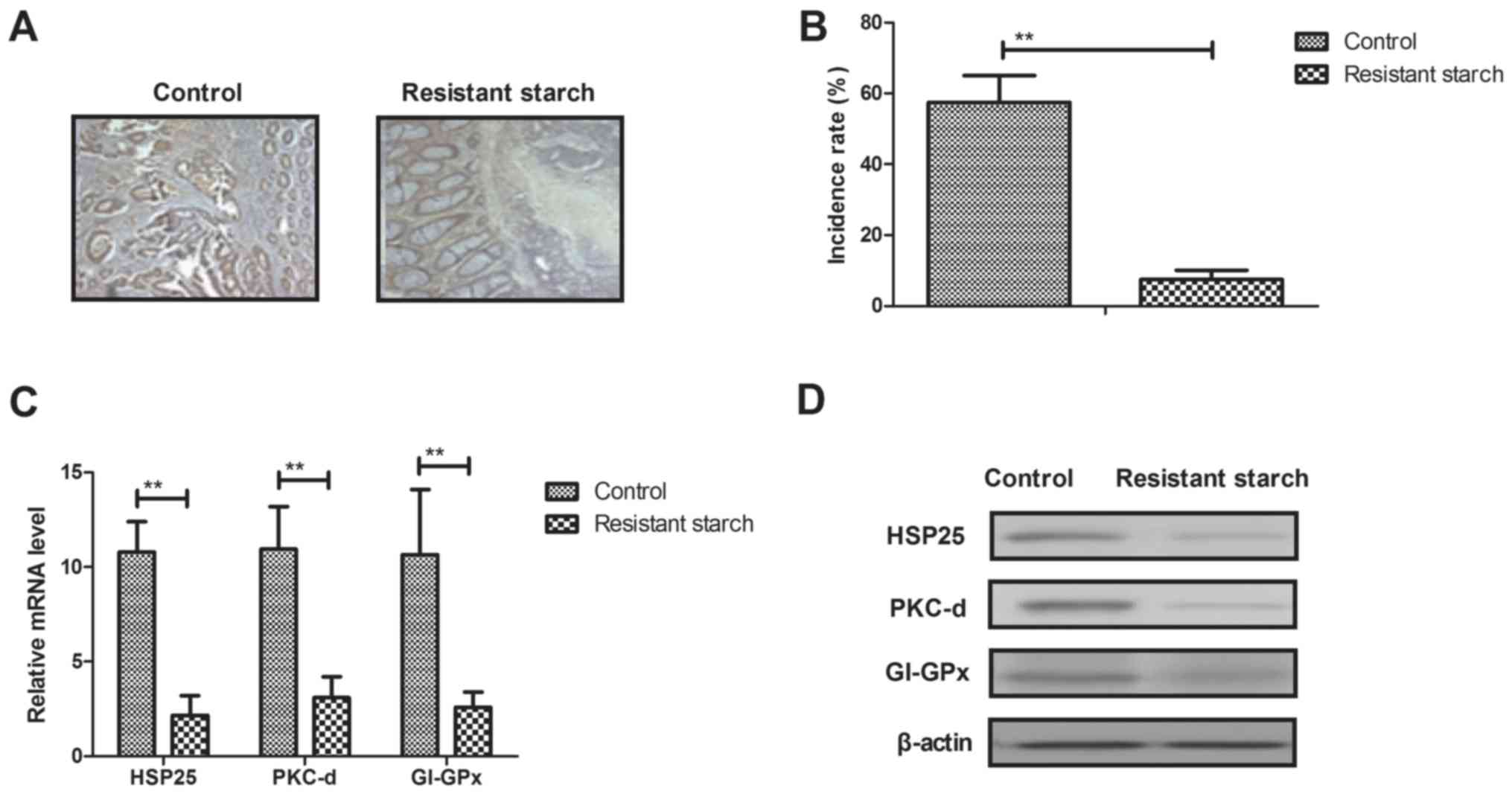 Anti-tumorigenesis efficacy of resistant starch was investigated in colon tissues induced by 1,2-dimethylhydrazine. Results showed that resistant starch suppressed tumor formation in experimental mice treated by 1,2-dimethylhydrazine (Fig. 2A). Histopathology demonstrated that resistant starch significantly inhibited incidence of colon tumor in mice model induced by 1,2-dimethylhydrazine (Fig. 2B). The gene and protein expression levels of carcinogenesis-associated genes, HSP25, PKC-d and GI-GPx, were downregulated in colon epithelial cells from mice receiving resistant starch compared with the standard starch group (Fig. 2C and D). However, the gene and protein expression levels of oncogenes c-myc, Ras and pro-apoptosis gene p53 were upregulated by resistant starch in colon epithelial cells (Fig. 2E and F). Immunofluorescence demonstrated that microtubule and tumor vessels were inhibited in colon tissues in mice in the resistant starch group compared with the control group (Fig. 2G). Immunohistochemistry demonstrated that the expression levels of MAT-1 and NRP-2 were downregulated by resistant starch in colon tumor tissues (Fig. 2H). These results indicated that a resistant starch diet inhibits tumorigenesis in colon tissues induced by 1,2-dimethylhydrazine.