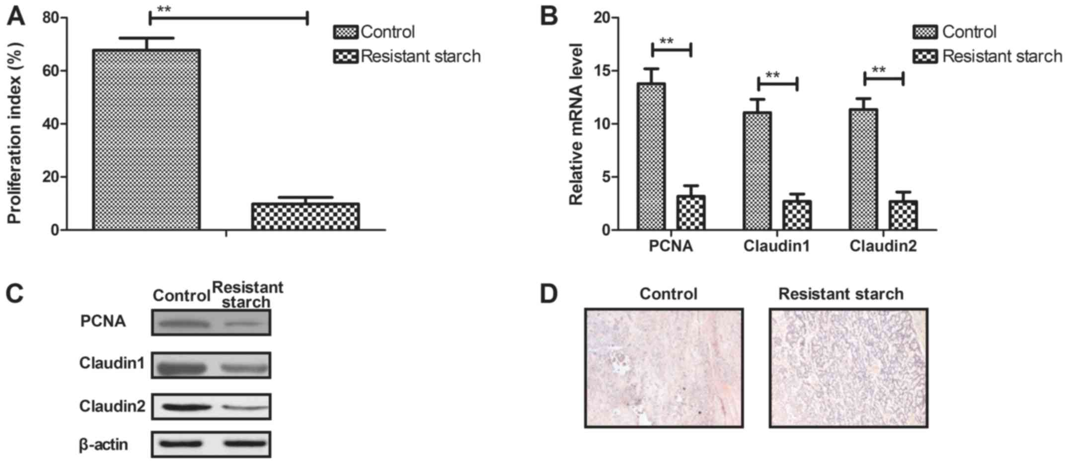Proliferation and differentiation of colon tumor cells contribute to tumor migration and invasion mediated by molecular signaling through effector pathways (39). In the present study, the resistant starch diet inhibited proliferation and differentiation of colon tumor cells by decreasing PCNA, claudin 1 and claudin 2 gene and protein expression levels. The results also indicated that resistant starch arrested the cell cycle of colon tumor cells and downregulated mTOR and HK-II expression levels, which may have contributed to the increased long-term survival of experimental mice in the resistant starch group compared with the control diet group.