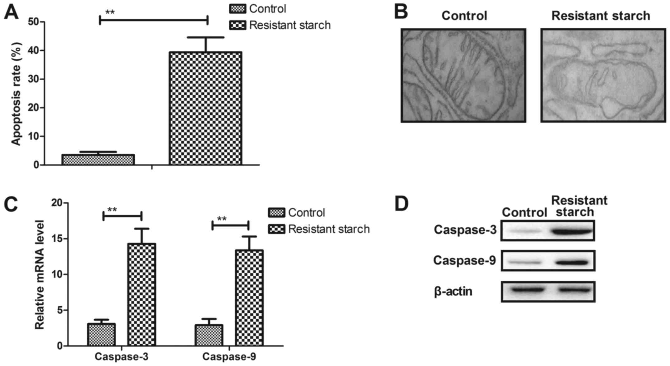 Induction of apoptosis by tumor therapeutic agents is essential for cancer therapy (40). In this study, the anti-cancer efficacy of resistant starch was investigated in mice induced with 1,2-dimethylhydrazine. The results demonstrated that resistant starch promoted apoptosis via the mitochondrial apoptotic pathway, and also increased the expression of tumor suppressor genes in colon epithelial cells. These results suggest that resistant starch contributes to apoptosis of colon tumor cells and anti-apoptosis efficacy of colon epithelial cells in experimental mice induced by 1,2-dimethylhydrazine. However, we observed that p53 was reduced by resistant starch, which is one of the most important tumor suppressor gene. Therefore, further study should perform to identify the inhibitory effects of resistant starch on tumor cells. Additionally, we found that oncogenes c-myc and Ras were upregulated by resistant starch, which also need to further analyzed in our future work.