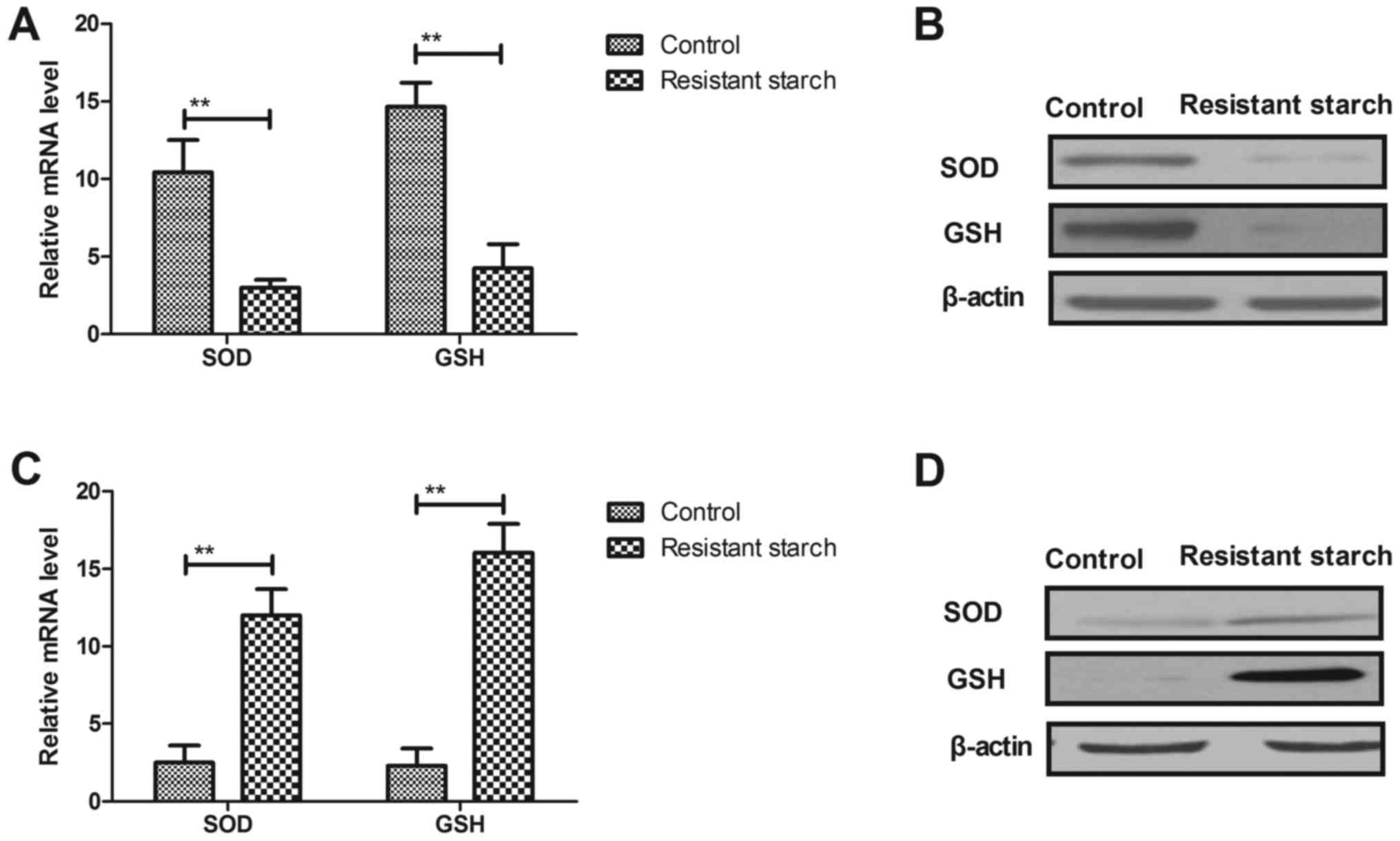Changes of oxidative stress in colon tumors and colon epithelial cells was investigated. Resistant starch diets reduced the mRNA and protein levels of SOD and GSH in colon tumor cells compared with mice that received the control diet (Fig. 5A and B). However, mRNA and protein levels of SOD and GSH were increased by resistant starch in colon epithelial cells compared to regular diet (Fig. 5C and D). AMP-activated protein kinase (AMPK) activity was increased in colon tumor cells from mice fed with resistant starch compared with the regular diet (Fig. 5E). Potential mechanisms were demonstrated as resistant starch increased the expression levels of DNA damage-inducible transcript 3 protein and Beclin 1 in colon tumor cells (Fig. 5F). The results also demonstrated that resistant starch promoted mitophagy and reticulophagy of colon tumor cells (Fig. 5G and H). Collectively, the results indicated that the resistant starch diet enhanced-activated autophagy in colon tumors through upregulation of autophagy genes.