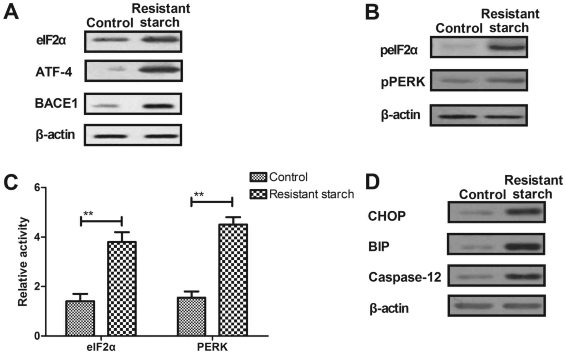 Studies have indicated that ER stress is associated with apoptosis of colon tumor cells (47). PERK activation has an important role in promoting tumorigenesis by attenuating apoptosis of premalignant granule cell precursors (48). The current study demonstrated that the resistant starch diet promoted the expression levels of eIF2α, ATF-4 and BACE1, and increased eIF2α activity in colon tumor cells. Mechanistic analysis indicated that knockdown of eIF2α exhibited inhibitory effects on CHOP, BIP and caspase-12 expression, and apoptosis in colon tumor cells isolated from mice fed with the resistant starch diet. The results of the present study indicated that the resistant starch diet promoted apoptosis by regulating ER stress-dependent PERK activity via upregulation of eIF2α activity in colon tumor cells from mice induced by 1,2-dimethylhydrazine, which contributes to tumor suppression.