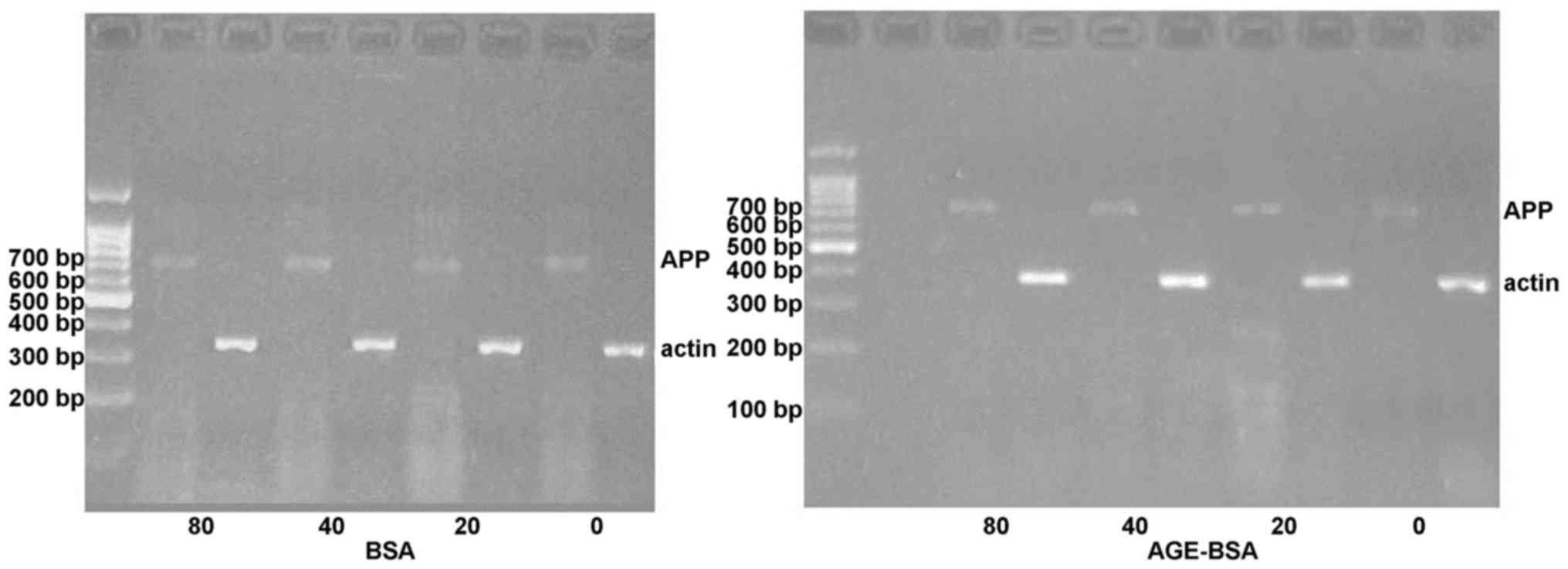 The group with the least influence on the state of cell growth was chosen. Compared with the control group, there was no significant difference on APP mRNA expression following treatment with AGE-BSA, or the BSA groups (Table V).