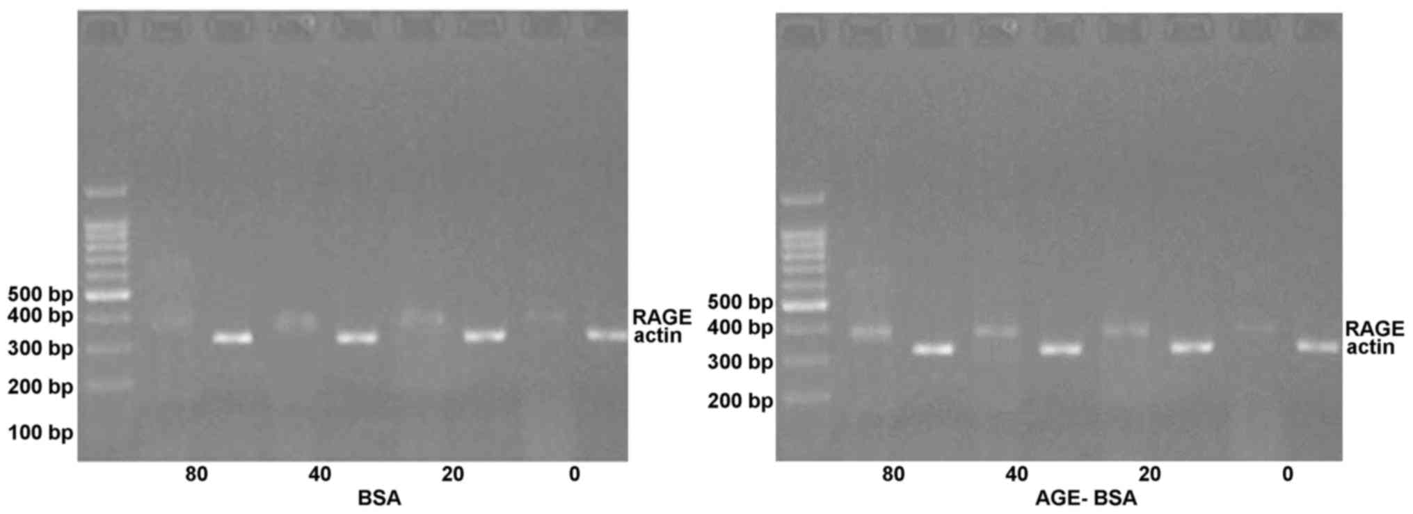 Compared with control group, there was no significant difference on RAGE mRNA expression following treatment with BSA alone. In the AGE-BSA group, the RAGE mRNA expression was significantly increased at 20 µg/ml (P<0.05). Moreover, at 40 µg/ml and 80 µg/ml, RAGE mRNA expression showed a significant difference as compared with the control group (RAGE mRNA). As compared with the corresponding BSA concentration group, RAGE mRNA expression was significantly increased following treatment with AGE-BSA (P<0.05; Table VI and Fig. 2).