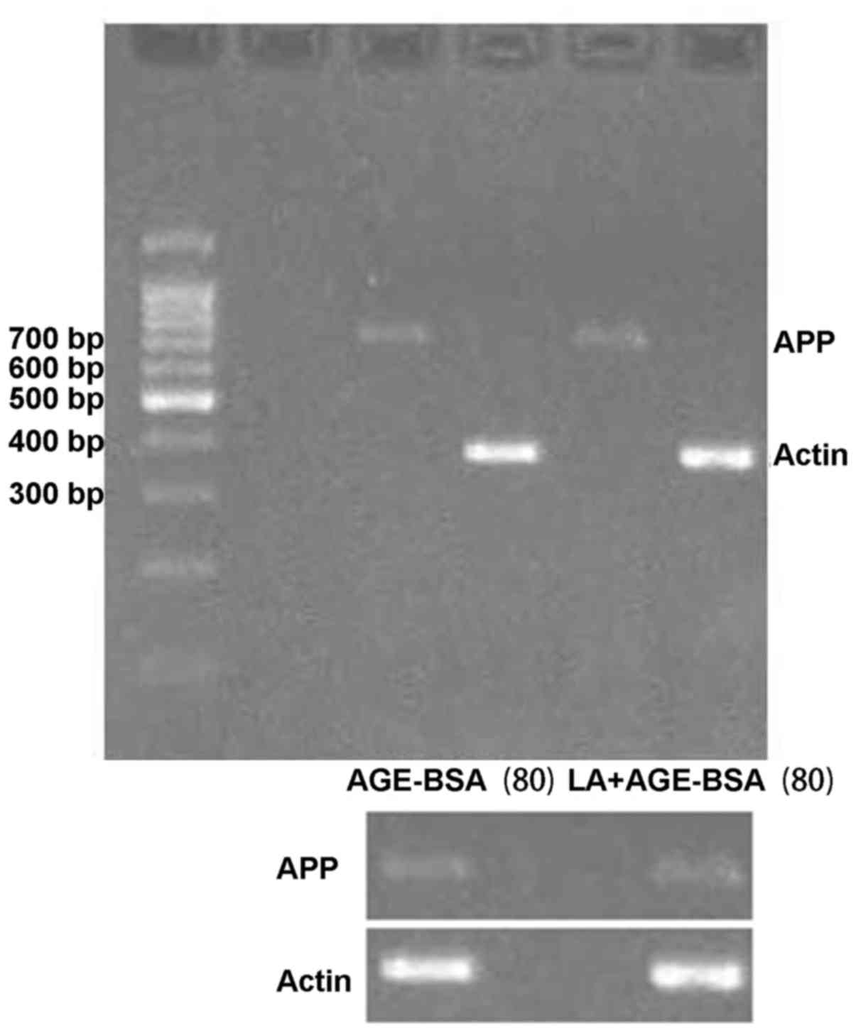 The cells in the AGE-BSA (8 µg/ml) group were chosen. In the α-LA (0.1 g/l) intervention group, there was no evidence of any changes in APP mRNA expression as compared with the control group (Table X and Fig. 4).