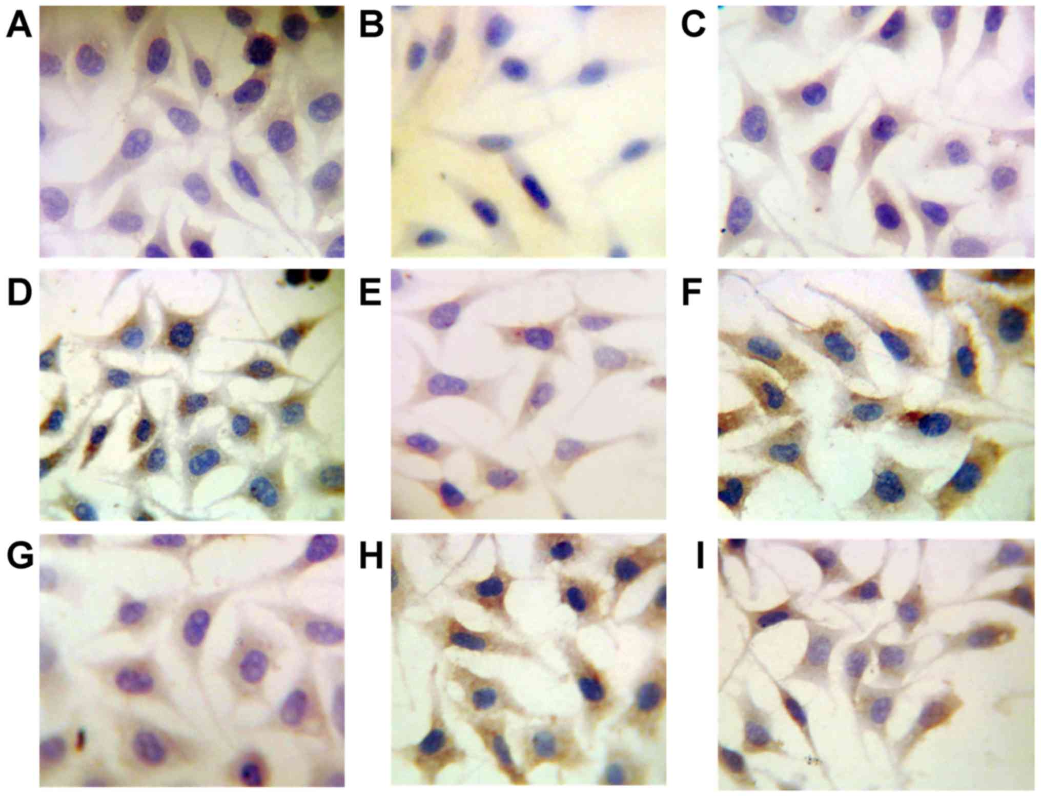 All data were analyzed by SPSS v.13.0 (SPSS, Inc. Chicago, IL, USA), and Microsoft Excel. The data are represented as mean ± SD. The comparisons of measured data among multiple groups were analyzed by one-way analysis of variance to determine the homogeneity test of variance. An α value of P<0.05 was considered to indicate a statistically significant difference.