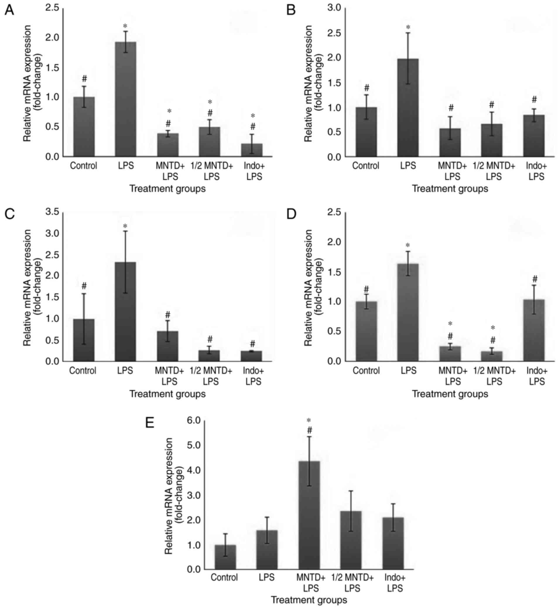 As indicated in Fig. 2D, NF-κB expression was significantly downregulated in the MNTD and ½ MNTD-treated groups compared with the LPS group (84.78 and 89.73%, respectively; P<0.05). Notably, this effect was greater in MNTD and ½ MNTD-treated groups compared with the Indo + LPS group. NF-κB expression did not decrease significantly in the Indo + LPS group compared with the LPS group. This may be due to the fact that NSAIDs such as indomethacin commonly block the downstream processes involved in inflammation, including COX-2 and its subsequent prostanoid production, but may not affect NF-κB expression (47). Previous studies investigating indomethacin have unveiled that its mechanism differs from aspirin, as it was demonstrated that indomethacin-induced COX-2 inhibition did not downregulate upstream NF-κB processes (48,49). The effects of madecassoside on NF-κB expression were previously reported by Su et al (13) and Patil et al (50). These results suggest that the downregulation of NF-κB may be caused by the inhibitory properties of madecassoside on essential complexes within the cascade, including the various subunits of inhibitory κB kinase.