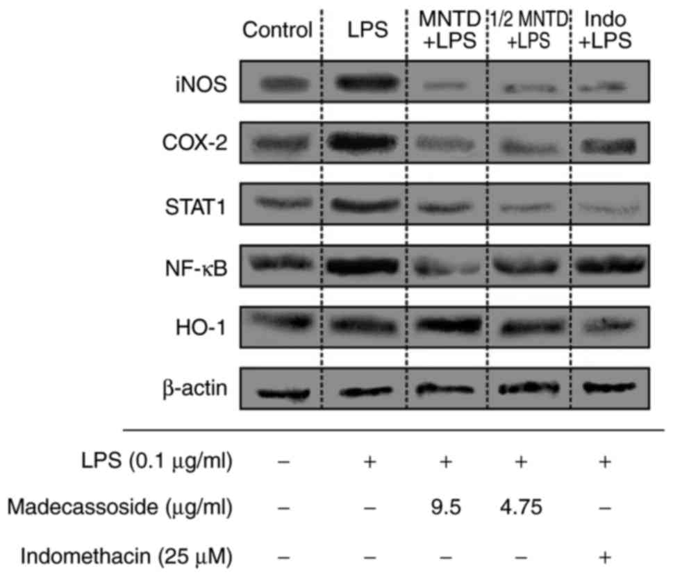The expression of neuroinflammation-associated proteins was determined using western blotting to confirm the gene expression profiles. As indicated in Fig. 3, the immunoblots of these proteins from the cell lysates of LPS-induced BV2 microglial cells following pre-treatment with madecassoside were assessed. The results indicated that the protein expression of the pro-neuroinflammatory components iNOS, COX-2, STAT1 and NF-κB was markedly increased in cells treated with LPS alone compared with the control group, whereas in madecassoside-treated groups, the expression of pro-inflammatory proteins was decreased in the MTND and ½ MNTD groups. Furthermore, the expression pattern of NF-κB protein in the Indo + LPS group was consistent with its gene expression. Furthermore, the protein expression of the anti-neuroinflammatory component HO-1 was notably increased in the MNTD + LPS group, which was also in accordance with its gene expression profile. In addition, indomethacin treatment also had similar effects to madecassoside on the protein expression of iNOS, COX-2, STAT1 and HO-1. The increase in NF-kB protein expression in the Indo + LPS group increased, which is consistent with the changes in its gene expression. Notably, the results of a previous study demonstrated the effects of madecassoside on inflammatory-associated signaling pathways, including iNOS and NF-κB, in murine kidneys, which indicated similar results to those demonstrated in a previous study (13). Furthermore, the anti-inflammatory effects of other triterpenoids extracted from Centella asiatica, including asiatic acid, have been demonstrated in a study utilizing murine liver samples (57), which further support the anti-neuroinflammatory abilities of madecassoside.