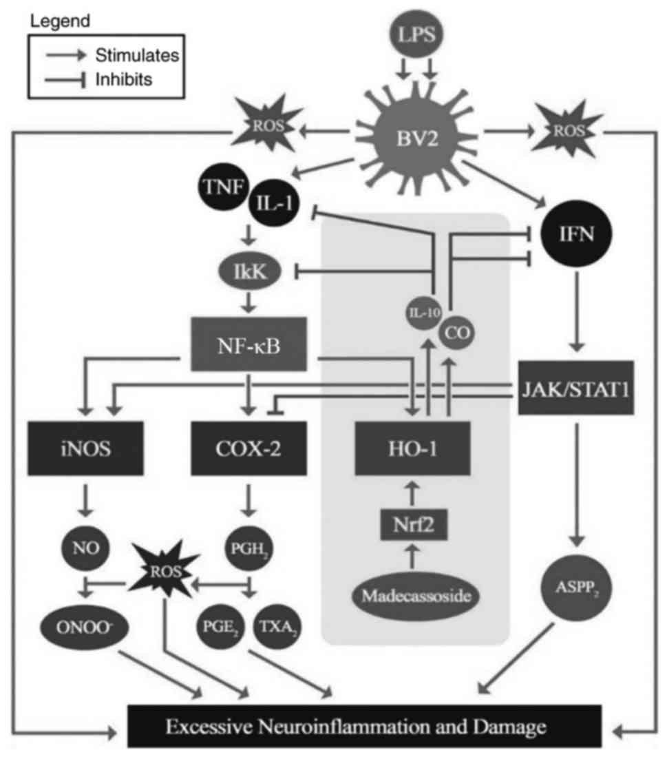 In conclusion, the present study indicated that madecassoside, a triterpenoid saponin, is a potent anti-neuroinflammatory agent, as it is able to reduce intracellular ROS levels and influence genomic and proteomic components that have been implicated in neuroinflammation. The results of the present study suggest that madecassoside successfully and significantly downregulated the gene and protein expression of iNOS, COX-2, STAT1 and NF-κB, all of which are pro-neuroinflammatory components. Furthermore, madecassoside at the MNTD significantly increased the gene expression of the anti-inflammatory component HO-1 by 175.22% compared with the LPS group. The primary results and the likely anti-neuroinflammatory mechanisms of madecassoside are presented in Fig. 4, whereby protein expression of pro-neuroinflammatory components were reduced while the anti-neuroinflammatory HO-1 was increased following madecassoside treatment. The antioxidative nature of madecassoside, which has been suggested to activate the Nrf2/HO-1 signaling pathways at the gene and protein levels, suggests that this compound may be an ideal treatment for neuroinflammation. The results of the present study warrant further in vivo studies investigating the effects of madecassoside to treat neuroinflammation, as it may be developed as a novel anti-neuroinflammatory agent.