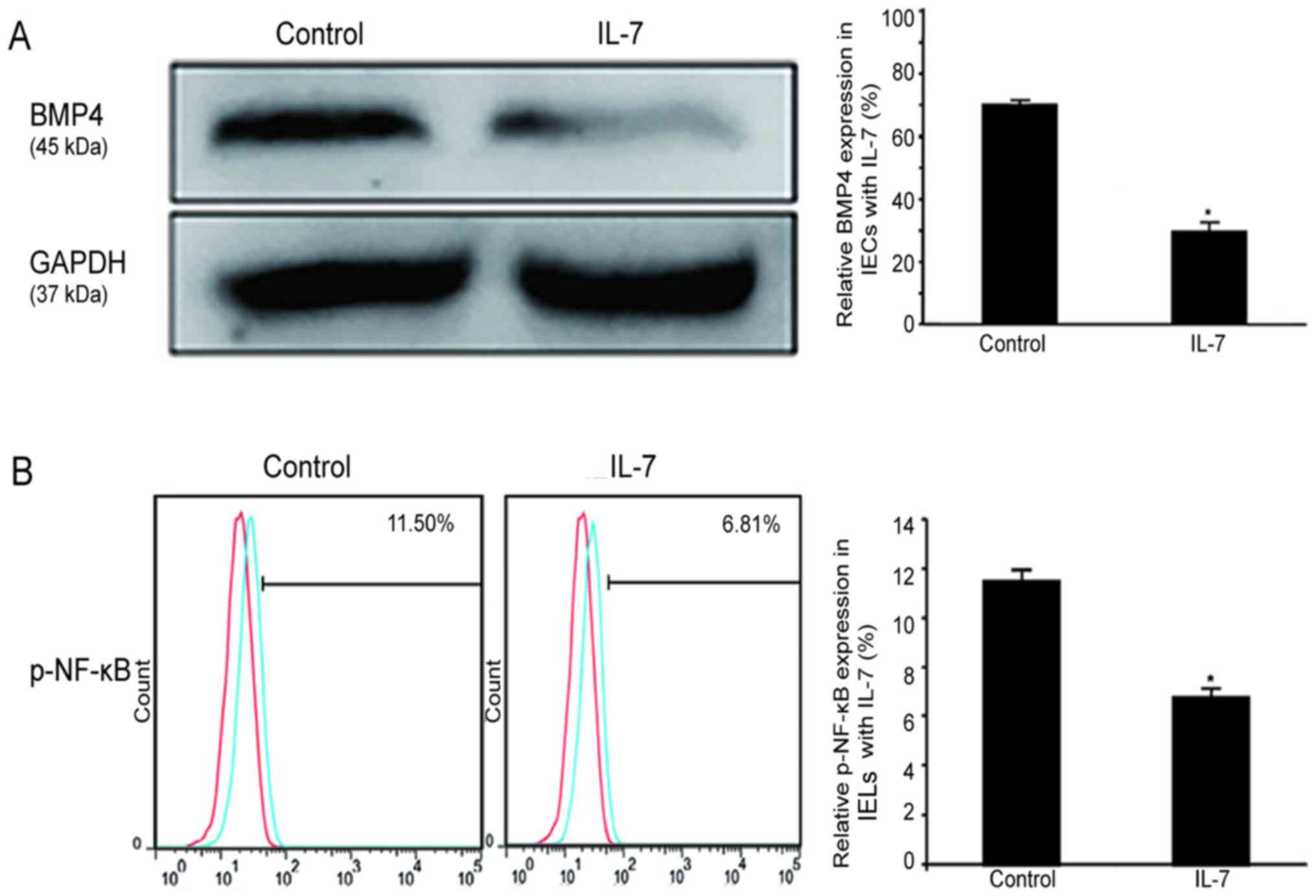To determine how to delay the induction of IEL apoptosis by BMP4 in the presence of IL-7, the expression of BMP4 in IECs under IL-7 protein (2 ng/ml) stimulation was evaluated by western blot analysis. The expression level of BMP4 was found to be significantly decreased, as shown in Fig. 7A. Moreover, flow cytometry revealed that the expression of phosphorylated NF-κB protein was downregulated as a result of IL-7 (2 ng/ml) stimulation in IELs in culture (5.18±1.12%), as shown in Fig. 7B. NF-κB signaling is known to increase the levels of inflammatory factors. It was hypothesized that IL-7 downregulates BMP4 and the phosphorylation of NF-κB, thereby decreasing the expression of inflammatory factors to prevent the apoptosis of IELs.