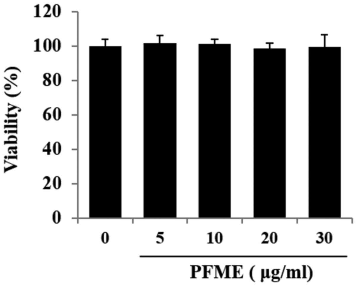 Fig. 1 shows the effect of PFME on cell viability as determined by the MTT assay, with morphology of the cells confirmed with microscopic pictures. Cell viability did not decrease significantly at concentrations of PFME up to 30 μg/ml. Accordingly, for all ensuing experiments, the concentration range used was 0-30 μg/ml PFME.